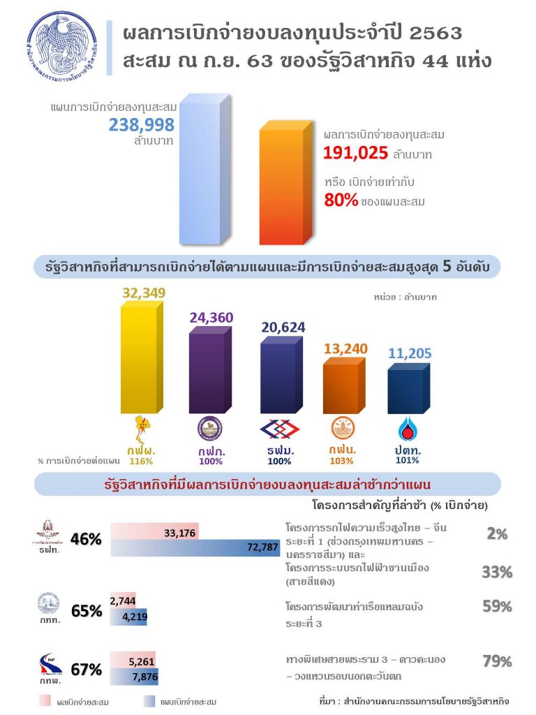 นายประภาศ คงเอียด ผู้อำนวยการสำนักงานคณะกรรมการนโยบายรัฐวิสาหกิจ (สคร.) เปิดเผยว่า เมื่อวันที่ 29 กันยายน 2563 คณะรัฐมนตรีมีมติเห็นชอบกรอบวงเงินเบิกจ่ายลงทุนปีงบประมาณ 2564 แล้วโดยรัฐวิสาหกิจที่ สคร. กำกับดูแล 44 แห่ง มีวงเงินลงทุน จำนวน 292,938 ล้านบาท แบ่งเป็นรัฐวิสาหกิจปีงบประมาณ จำนวน 163,515 ล้านบาท และรัฐวิสาหกิจปีปฏิทิน จำนวน 129,424 ล้านบาท โดยมีเป้าหมายให้รัฐวิสาหกิจเบิกจ่ายงบลงทุนให้ไม่ต่ำกว่าร้อยละ 95 ของกรอบวงเงินอนุมัติให้เบิกจ่ายลงทุน ซึ่ง สคร. ได้เตรียมความพร้อมในการติดตามรัฐวิสาหกิจให้เร่งจัดทำแผนการเบิกจ่ายที่สอดคล้องกับวงเงินที่ได้รับความเห็นชอบแล้ว สำหรับการติดตามการเบิกจ่ายงบลงทุนในปี 2563 ตามปกติ ณ สิ้นเดือนกันยายน 2563 มีผลการเบิกจ่ายงบลงทุนสะสมจำนวน 191,280 ล้านบาท หรือคิดเป็นร้อยละ 80 ของแผนการเบิกจ่ายสะสม และในกรณีที่ไม่รวมโครงการลงทุนขนาดใหญ่ที่ดำเนินการล่าช้ามาอย่างต่อเนื่องจะทำให้ในภาพรวมรัฐวิสาหกิจมีผลการเบิกจ่ายงบลงทุนสะสมจะประมาณร้อยละ 96 ของแผนการเบิกจ่ายสะสม ทั้งนี้ สคร. ยังคงติดตามดูแลโครงการลงทุนในปี 2563 ที่เบิกจ่ายล่าช้าอย่างใกล้ชิดและต่อเนื่อง