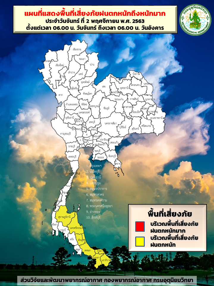 กรมอุตุฯ 2 พ.ย. – กรมอุตุฯ เผยภาคเหนือ-อีสาน อากาศเย็น กับมีฝนบางแห่ง ขณะที่ภาคใต้ยังมีฝนฟ้าคะนองในระยะนี้ ส่วนกรุงเทพฯ-ปริมณฑล ฝนฟ้าคะนอง 20% ของพื้นที่
