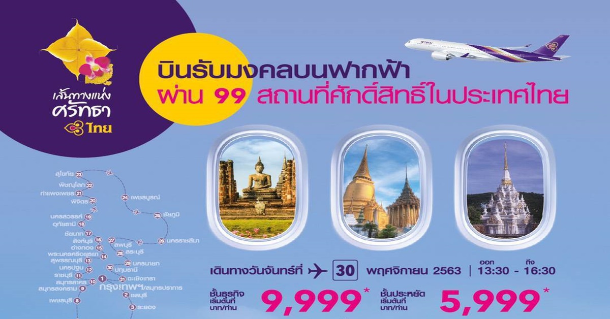 นายวิวัฒน์ ปิยะวิโรจน์ รองกรรมการผู้อำนวยการใหญ่สายการพาณิชย์ บริษัท การบินไทยฯ เปิดเผยว่า เพื่อเป็นการส่งเสริมและกระตุ้นการท่องเที่ยวไทยตามนโยบายของรัฐบาล และเปิดประสบการณ์การเดินทางในรูปแบบใหม่ ภายใต้โครงการ THAI Magical Flying Experience แคมเปญ “มงคลบนฟากฟ้า” โดยการเดินทางด้วยเครื่องบิน บินวนไม่ลงจอด พร้อมสวดมนต์รับพลังบวกบนฟ้า รวมทั้งเป็นการต่อยอดแคมเปญ “เที่ยวไทยรับพลังบวก” ของการท่องเที่ยวแห่งประเทศไทย (ททท.) บริษัท การบินไทยฯ จัดเที่ยวบินพิเศษ “บินรับมงคลบนฟากฟ้า ผ่าน 99 สถานที่ศักดิ์สิทธิ์ในประเทศไทย” นำนักท่องเที่ยวเดินทางพร้อมสวดมนต์ภาวนาบนเครื่องบินของการบินไทย เพื่อเป็นการเสริมสิริมงคลให้กับชีวิต นำสวดโดย อาจารย์คฑา ชินบัญชร ผู้เชี่ยวชาญด้านประวัติศาสตร์ ศาสนา และวัฒนธรรม โดยจัดเที่ยวบินพิเศษ เที่ยวบินที่ ทีจี 8999 ในวันที่ 30 พฤศจิกายน 2563 ออกเดินทางจากท่าอากาศยานสุวรรณภูมิ เวลา 13.30 น. ทำการบินผ่านสถานที่ศักดิ์สิทธิ์ 99 แห่ง ใน 31 จังหวัดของประเทศไทย อาทิ กรุงเทพ ชลบุรี ระยอง สุราษฏร์ธานี ประจวบคีรีขันธ์ นครปฐม สุพรรณบุรี อยุธยา พิษณุโลก สุโขทัย ชัยภูมิ นครราชสีมา และทำการบินกลับมายังท่าอากาศยานสุวรรณภูมิ เวลา 16.30 น. ในวันเดียวกัน โดยใช้เวลาทำการบินประมาณ 3 ชั่วโมง ราคาบัตรโดยสาร ชั้นประหยัด เริ่มต้นที่ 5,999 บาท ชั้นธุรกิจ เริ่มต้นที่ 9,999 บาท ผู้สนใจสามารถสำรองที่นั่ง และออกบัตรโดยสาร ได้ที่ โทร. 0-2356-1515 ตั้งแต่วันที่ 2 – 25 พฤศจิกายน 2563 ระหว่างเวลา 08.30 น. – 17.30 น. ในวันจันทร์ – ศุกร์ ยกเว้นวันเสาร์ – อาทิตย์ และวันหยุดนักขัตฤกษ์