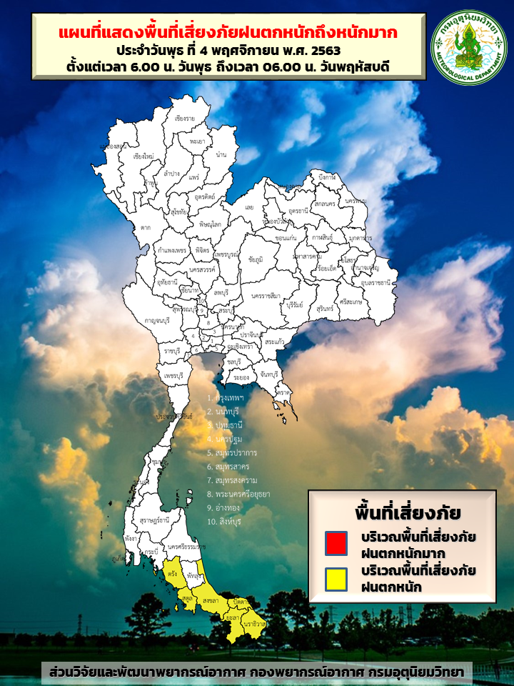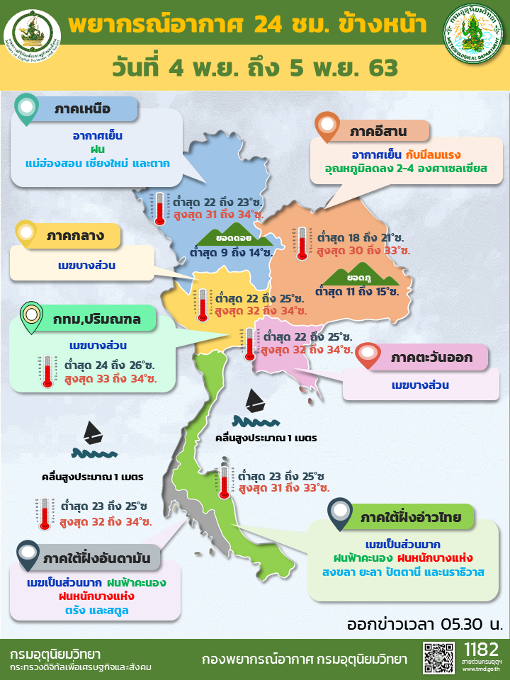 กรมอุตุฯ 4 พ.ย. – กรมอุตุฯ เผยภาคเหนือ-อีสาน อากาศเย็น และอุณหภูมิลดลง โดยมีฝนบางแห่งในภาคเหนือ ขณะที่ภาคใต้ยังมีฝนตกหนักในระยะนี้