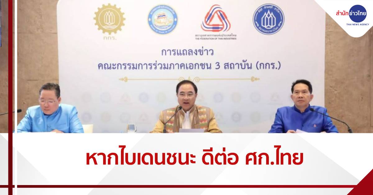 กรุงเทพฯ 4 พ.ย. – กกร.เชื่อหาก โจ ไบเดน ชนะเลือกตั้งประธานาธิบดีสหรัฐ จะส่งผลดีต่อเศรษฐกิจไทย แต่ถ้าโดนัลด์ ทรัมป์ชนะ ทุกอย่างจะไม่ต่างไปจากตอนนี้ แนะรัฐบาลเร่งเดินหน้าเจรจาข้อตกลงการค้าพหุภาคี ทั้ง FTA Thai-UK, FTA Thai-EU, CPTPP