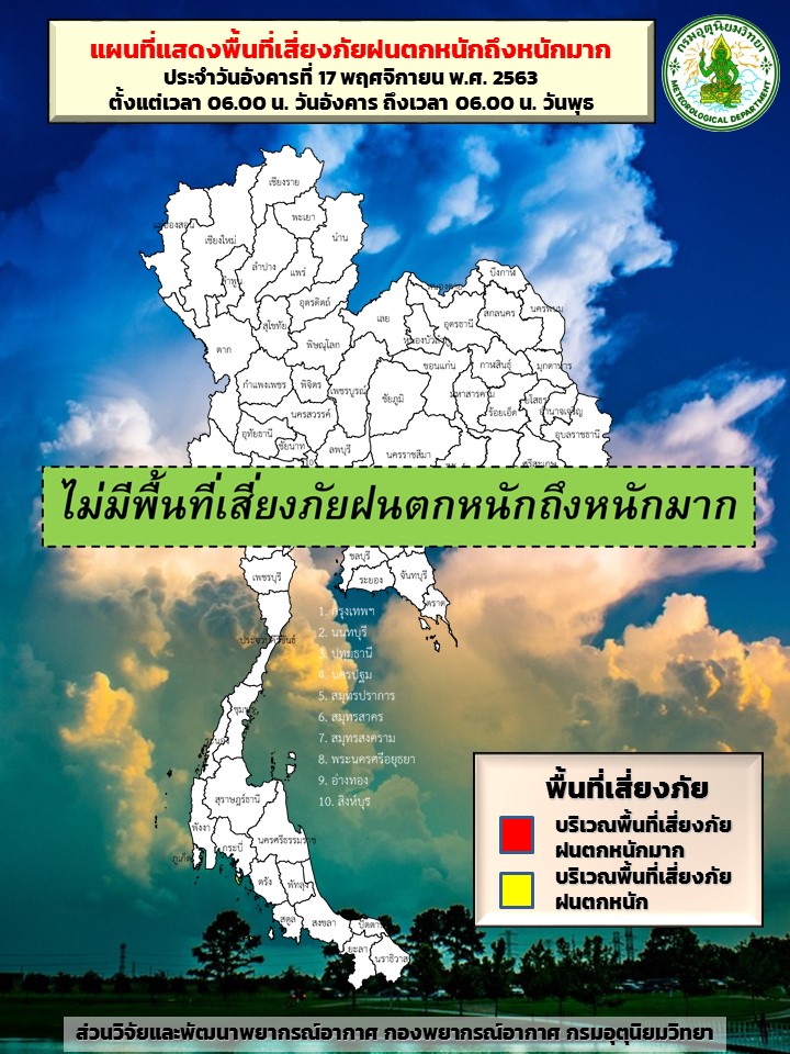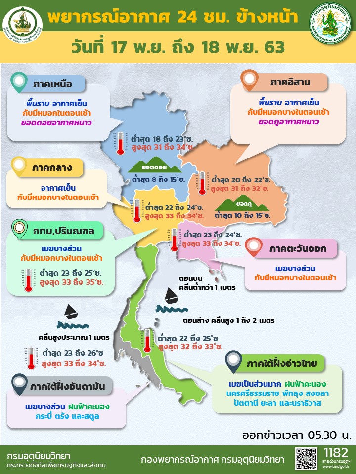 กรมอุตุฯ 17 พ.ย. – กรมอุตุฯ เผยไทยตอนบนอุณหภูมิสูงขึ้นเล็กน้อย แต่ยังคงมีอากาศเย็น กับมีหมอกตอนเช้า ยอดดอย-ยอดภูหนาว ส่วนกรุงเทพฯ-ปริมณฑล มีหมอกบางตอนเช้า อุณหภูมิต่ำสุด 23-25 องศาฯ