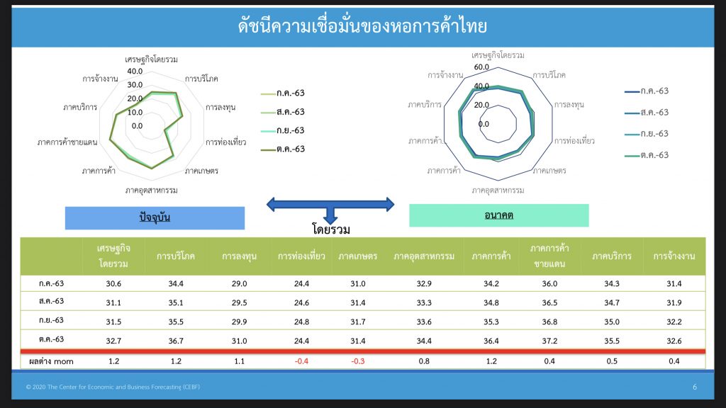 นายธนวรรธน์ พลวิชัย อธิการบดีมหาวิทยาลัยหอการค้าไทย และประธานที่ปรึกษาศูนย์พยากรณ์เศรษฐกิจและธุรกิจ กล่าวว่า ดัชนีความเชื่อมั่นหอการค้าไทย (TCC-CI) ประจำเดือน ต.ค.63 ดัชนีฯ ปรับตัวดีขึ้นอยู่ที่ระดับ 33.2 จากที่เดือน ก.ย.63 อยู่ที่ระดับ 32.5 โดยดัชนีต่างๆ ปรับตัวดีขึ้น ยกเว้นการท่องเที่ยวและภาคเกษตรที่ยังคงติดลบ 0.4% และลบ 0.3% ตามลำดับ เนื่องจากการท่องเที่ยวยังไม่มีการเปิดรับนักท่องเที่ยวรวมถึงยังคงมีสถานการณ์แพร่ระบาดในแหล่งท่องเที่ยวในประเทศที่ปรากฏเป็นข่าวทำให้ประชาชนยังไม่กล้าจะออกไปท่องเที่ยวเต็มที่ ประกอบกับสถานการณ์โควิด-19 ในต่างประเทศยังมีการแพร่ระบาดอยู่ แต่ไตรมาส 4 มีแนวโน้มดีขึ้น
