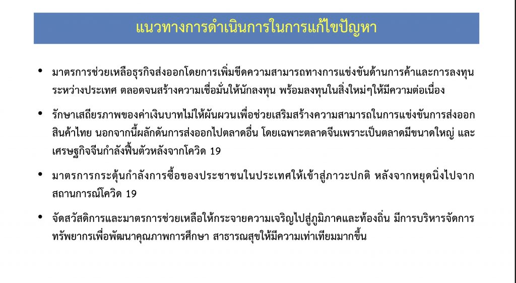แนวทางแก้ไขปัญหาที่ต้องการเห็นได้แก่ มาตรการช่วยเหลือธุรกิจส่งออกโดยการเพิ่มขีดความสามารถในการแข่งขันด้านการค้าและการลงทุนระหว่างประเทศ ตลอดจนสร้างความเชื่อมั่นให้นักลงทุน พร้อมลงทุนในสิ่งใหม่ ๆ ให้มีความต่อเนื่อง, รักษาเสถียรภาพของค่าเงินบาทไม่ให้ผันผวนเพื่อช่วยเสริมสร้างความสามารถในการแข่งขันการส่งออกสินค้าไทย นอกจากนี้ ผลักดันการส่งออกไปตลาดอื่น ๆ เพิ่มเติม โดยเฉพาะตลาดจีนเพราะมีขนาดใหญ่และเศรษฐกิจจีนกำลังฟื้นตัวหลังจากโควิด-19, มาตรการกระตุ้นกำลังการซื้อของประชาชนในประเทศให้เข้าสู่ภาวะปกติ หลังจากหยุดนิ่งไปจากสถานการณ์โควิด-19, และจัดสวัสดิการและมาตรการช่วยเหลือให้กระจายความเจริญไปสู่ภูมิภาคและท้องถิ่น มีการบริหารจัดการทรัพยากรเพื่อพัฒนาคุณภาพการศึกษา สาธารณสุขให้มีความเท่าเทียมมากขึ้น . – สำนักข่าวไทย