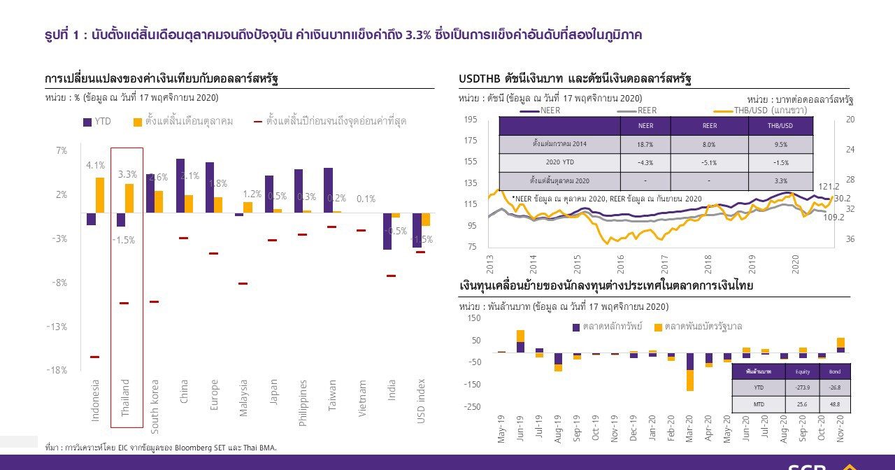 ส่วนค่าเงินบาทตั้งแต่สิ้นเดือนตุลาคมจนถึงปัจจุบัน แข็งค่าถึง 3.3% ซึ่งเป็นการแข็งค่าอันดับที่สองในภูมิภาค เป็นผลจากการอ่อนค่าของเงินดอลลาร์สหรัฐ ผลการเลือกตั้งประธานาธิบดีสหรัฐฯ และความเชื่อมั่นของนักลงทุนที่ปรับสูงขึ้นหลังจากมีข่าวดีเกี่ยวกับการพัฒนาการผลิตวัคซีน COVID-19 ทำให้มีเงินไหลเข้ากลุ่มประเทศตลาดเกิดใหม่ โดยเฉพาะไทยที่ยังมีเสถียรภาพต่างประเทศอยู่ในเกณฑ์ดีทำให้นักลงทุนยังมีความเชื่อมั่นต่อสินทรัพย์ไทย ซึ่งการแข็งค่าของเงินบาทนี้อาจเป็นอุปสรรคต่อการฟื้นตัวของเศรษฐกิจไทย ธปท. จึงอาจพิจารณาดำเนินมาตรการทางการเงินเพื่อชะลอการแข็งค่าของเงินบาท โดยนโยบายด้านการคลังอาจเข้ามามีส่วนช่วยชะลอการแข็งค่าของเงินบาทได้ในระยะต่อไป . – สำนักข่าวไทย