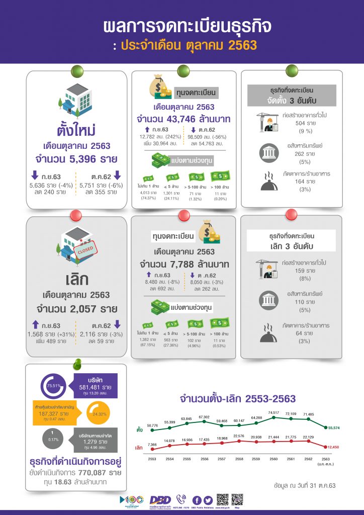 อย่างไรก็ตาม ส่งผลให้ยอดจดทะเบียนตั้งใหม่ในช่วง 10 เดือนแรกของปี 2563 ตั้งแต่มกราคม-ตุลาคม 63 มียอดทั้งสิ้น 55,574 ราย ลดลงเมื่อเทียบกับช่วงเดียวกันปีที่ผ่านมาร้อยละ 12 หรือลดลง 7,785 ราย ขณะที่ยอดเลิกกิจการในช่วง 10 เดือนตั้งแต่ มกราคม-ตุลาคม 63 มียอดทั้งสิ้น 12,450 ราย ลดลงเมื่อเทียบกับช่วงเดียวกันปีที่ผ่านมาร้อยละ 12 หรือลดลง 1,620 ราย ส่งผลให้ธุรกิจดำเนินกิจการอยู่ ณ วันที่ 31 ต.ค. 63 ธุรกิจที่ดำเนินกิจการอยู่ทั่วประเทศ จำนวน 770,087 ราย มูลค่าทุน 18.63 ล้านล้านบาท จำแนกเป็นห้างหุ้นส่วนจำกัด ห้างหุ้นส่วนสามัญนิติบุคคล จำนวน 187,327 ราย คิดร้อยละ เป็น 24.32 บริษัทจำกัด จำนวน 581,481 ราย คิดเป็น ร้อยละ 75.51 และบริษัทมหาชนจำกัด จำนวน 1,279 ราย คิดเป็นร้อยละ 0.17 ตามลำดับ