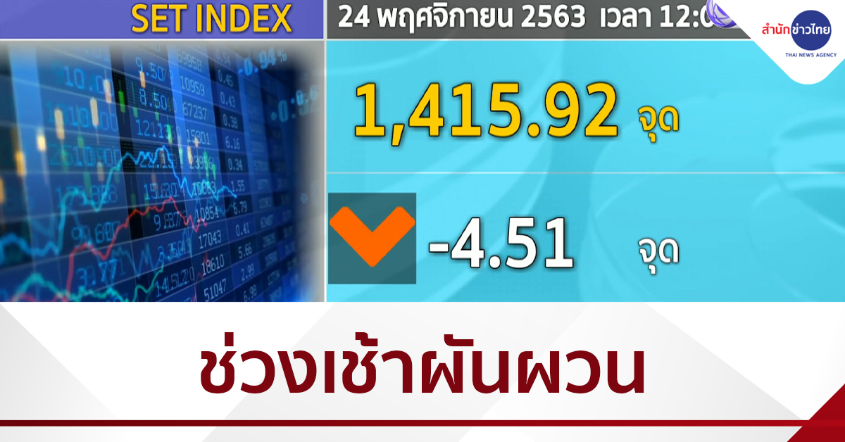 24 พ.ย.-ตลาดหุ้นไทยช่วงเช้า ผันผวน ตลาดตอบรับปัจจัยเชิงบวกจากวัคซีนต้านโควิด – 19 คืบหน้า และ ‘ทรัมป์’ เริ่มกระบวนการถ่ายโอนอำนาจให้ ‘โจ ไบเดน’ แล้ว คาดมีการประกาศรายชื่อ ครม.สหรัฐชุดใหม่เร็วๆ นี้ ขณะที่ปัจจัยในประเทศยังมีความกังวลกับการชุมนุมวันที่ 25 พ.ย.นี้