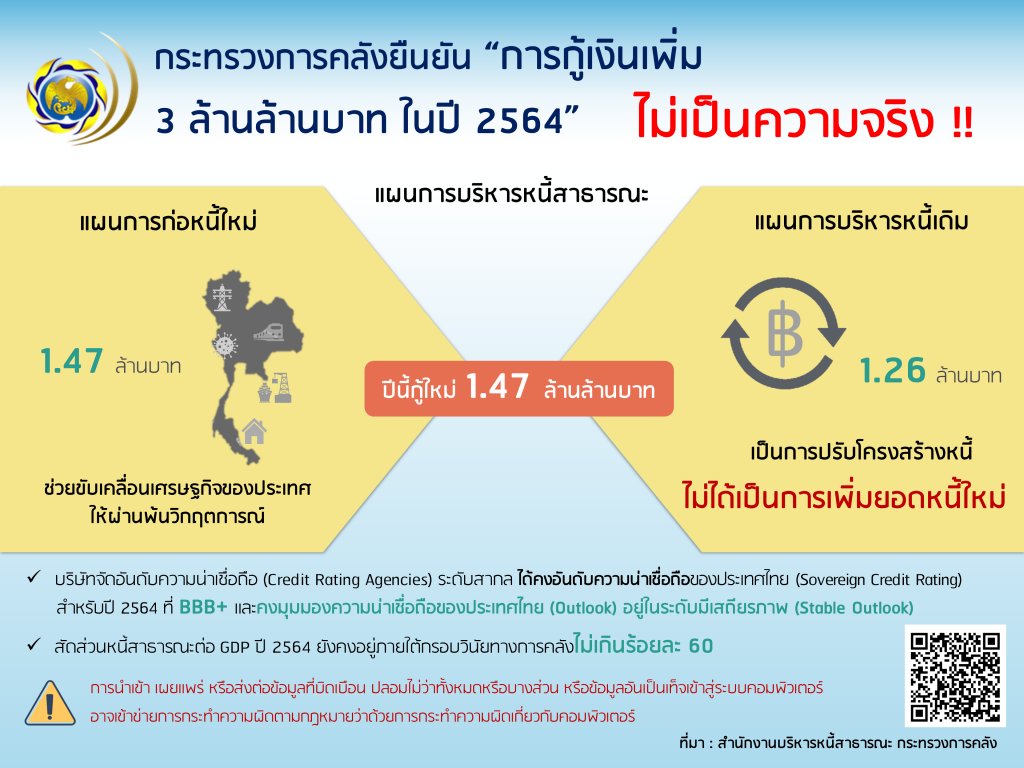 นางแพตริเซีย มงคลวนิช ผู้อำนวยการสำนักงานบริหารหนี้สาธารณะ ขอชี้แจงว่า ข่าวดังกล่าวไม่เป็นความจริง ทั้งนี้ ในแผนการบริหารหนี้สาธารณะ ประจำปีงบประมาณ 2564 จะมีรายการก่อหนี้ใหม่ จำนวน 1.47 ล้านล้านบาท ประกอบด้วย การกู้เงินเพื่อชดเชยการขาดดุลงบประมาณ จำนวน 623,000 ล้านบาท การกู้เงินเพื่อกระตุ้นเศรษฐกิจภายใต้แผนงานตามพระราชกำหนดให้อำนาจกระทรวงการคลังกู้เงินเพื่อแก้ไขปัญหา เยียวยา และฟื้นฟูเศรษฐกิจและสังคมที่ได้รับผลกระทบจากการระบาดของโรคติดเชื้อไวรัสโคโรนา 2019 พ.ศ. 2563 จำนวน 550,000 ล้านบาท การกู้เงินเพื่อสนับสนุนการลงทุนด้านโครงสร้างพื้นฐานของรัฐบาลและรัฐวิสาหกิจ เพื่อให้สามารถดำเนินการได้อย่างต่อเนื่อง จำนวน 133,657 ล้านบาท และการกู้เงินเพื่อเสริมสภาพคล่องให้แก่รัฐบาลและรัฐวิสาหกิจที่ได้รับผลกระทบจากสถานการณ์การแพร่ระบาดของ COVID-19 จำนวน 158,782 ล้านบาท ทั้งนี้ ในภาวะวิกฤติที่เกิดขึ้นในปัจจุบัน การกู้เงินเพื่อการลงทุนและกระตุ้นเศรษฐกิจของภาครัฐเป็นกลไกสำคัญ และเป็นกลไกหลักในการขับเคลื่อนเศรษฐกิจของประเทศให้ผ่านวิกฤตการณ์ดังกล่าวไปได้