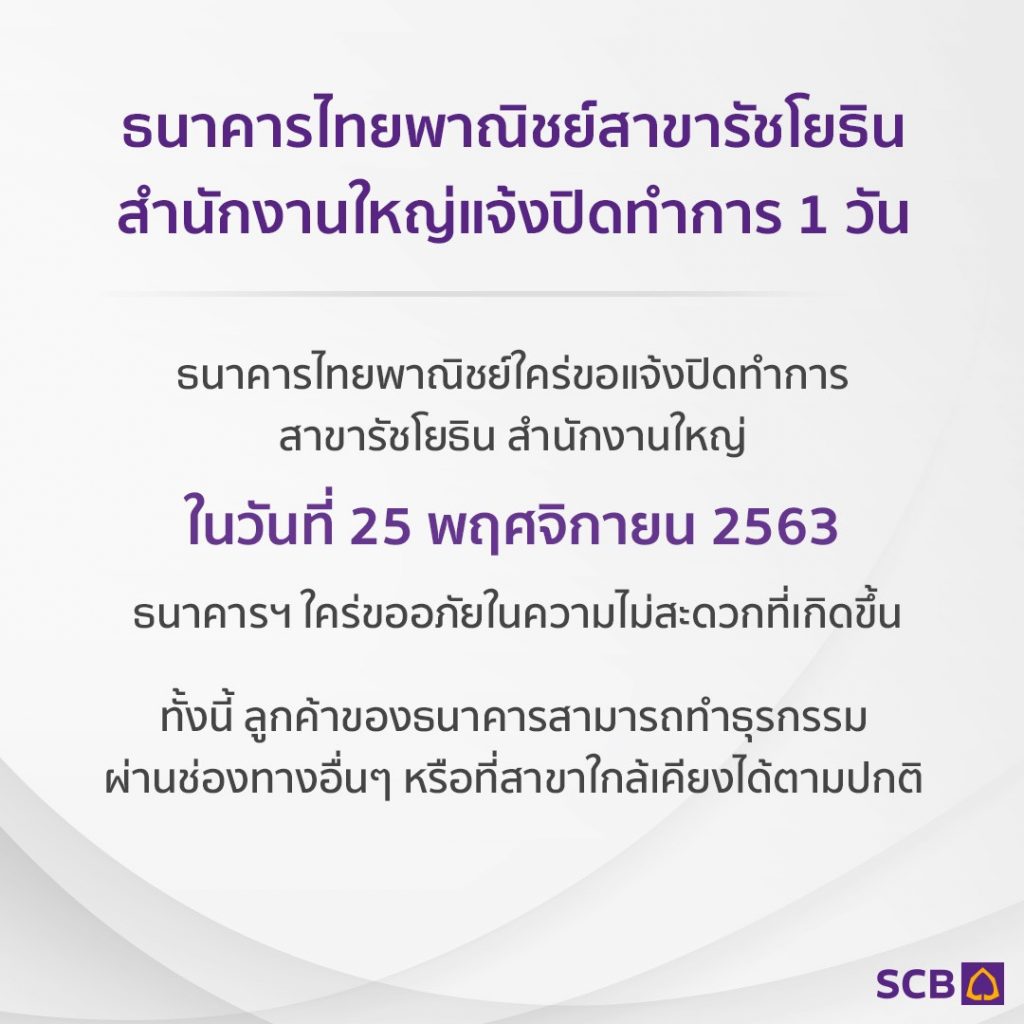 กรุงเทพฯ 25 พ.ย. – ธนาคารไทยพาณิชย์สำนักงานใหญ่ สาขารัชโยธิน แจ้งปิดทำการหนึ่งวัน