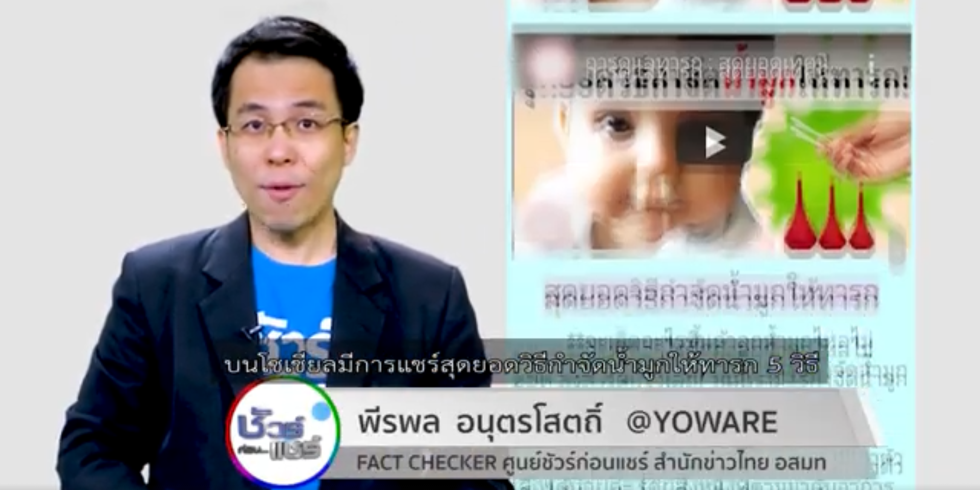 24 พ.ย. – บนสังคมออนไลน์มีการแชร์สุดยอดวิธีกำจัดน้ำมูกทารก 5 วิธี ข้อเท็จจริงเรื่องนี้เป็นอย่างไร ติดตามกับ คุณพีรพล อนุตรโสตถิ์ จากศูนย์ชัวร์ก่อนแชร์