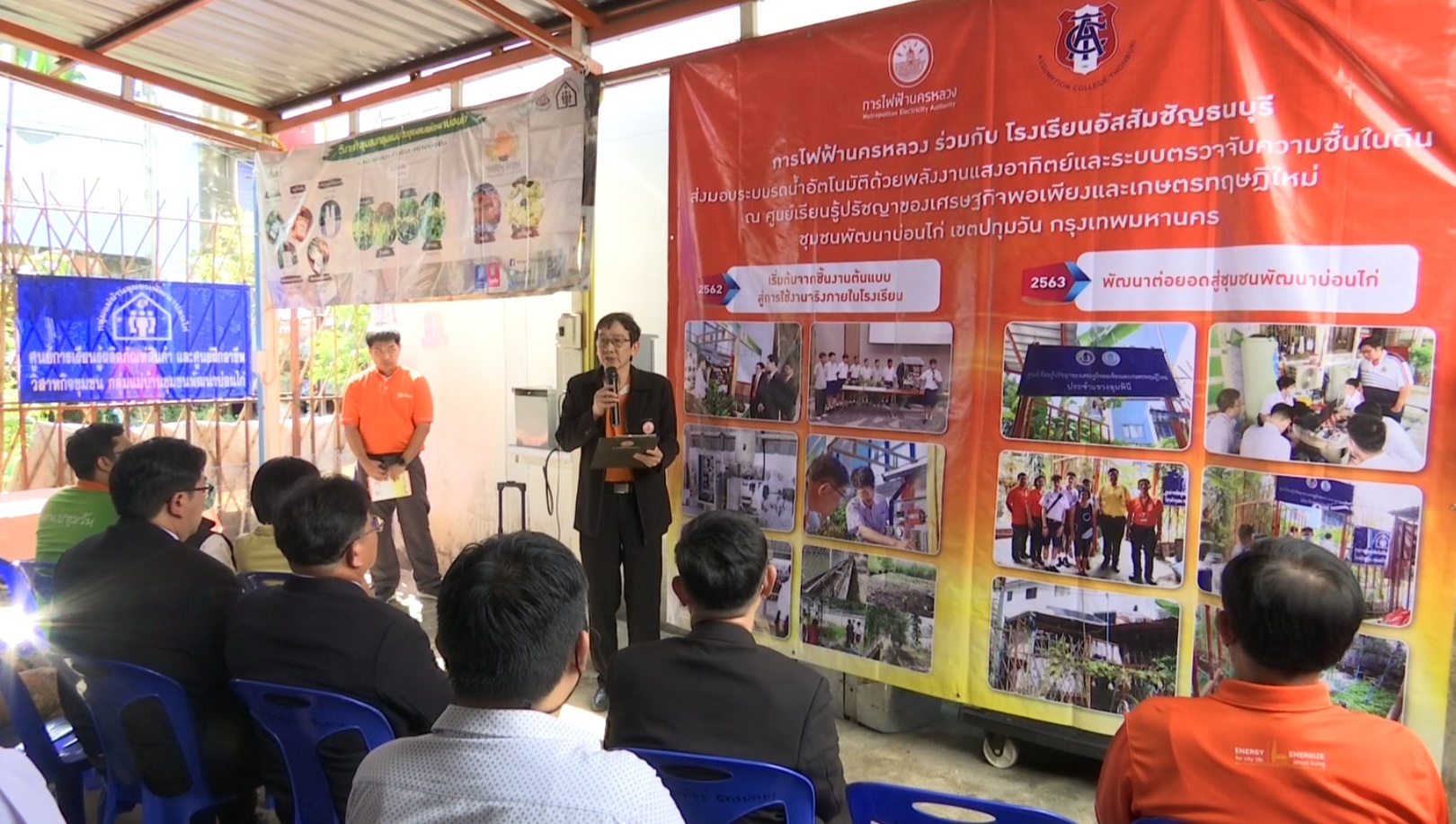 นายชาญเวช ยุวชิต ผู้ช่วยผู้ว่าการการไฟฟ้านครหลวง (กฟน.) หรือ MEA เป็นประธานในพิธีส่งมอบระบบรดน้ำอัตโนมัติด้วยพลังงานแสงอาทิตย์และเซ็นเซอร์ตรวจจับความชื้นในดินให้แก่ชุมชนพัฒนาบ่อนไก่เพื่อเป็นการต่อยอดการพัฒนานวัตกรรมในชุมชน ภายใต้โครงการเสริมสร้างความเข้มแข็งให้แก่ชุมชน ณ ศูนย์เรียนรู้ปรัชญาเศรษฐกิจพอเพียงและเกษตรทฤษฎีใหม่ ชุมชนพัฒนาบ่อนไก่ เขตคลองเตย ซึ่งเป็นผลงานนวัตกรรมของโรงเรียนอัสสัมชัญธนบุรี ที่ กฟน.สนับสนุนงบประมาณและควบคุมการดำเนินงานเมื่อปี 2562