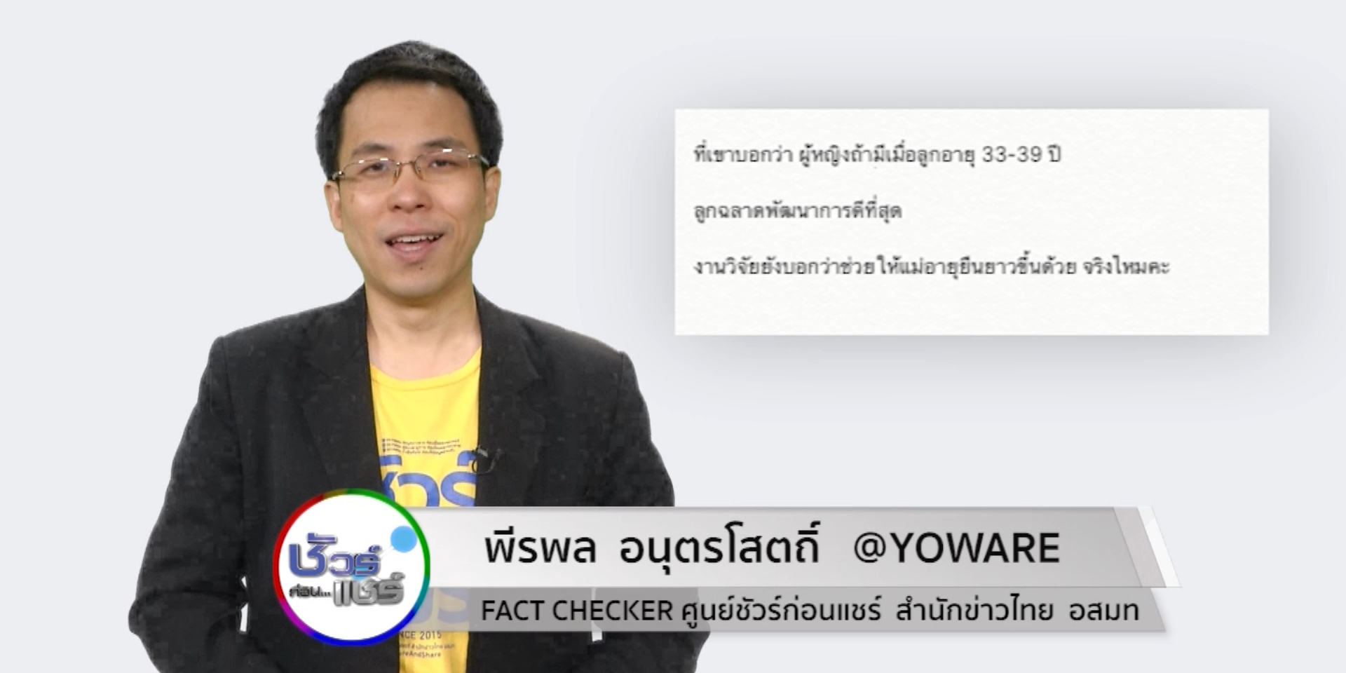 25 พ.ย. – บนสังคมออนไลน์ แชร์คำแนะนำว่า หากผู้หญิงมีลูกในช่วงอายุ 33-39 ปี ลูกจะฉลาดพัฒนาการดี แต่ข้อเท็จจริงเรื่องนี้เป็นอย่างไร ติดตามกับ คุณพีรพล อนุตรโสตถิ์ จากศูนย์ชัวร์ก่อนแชร์