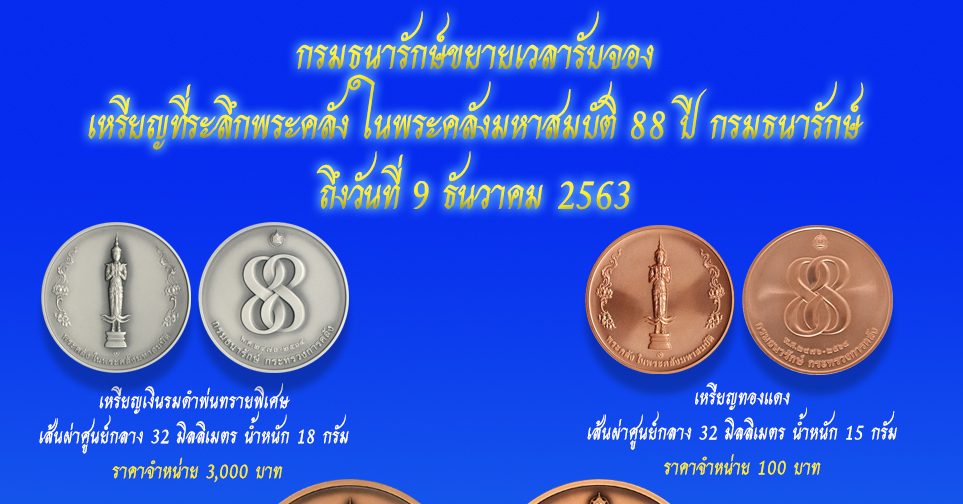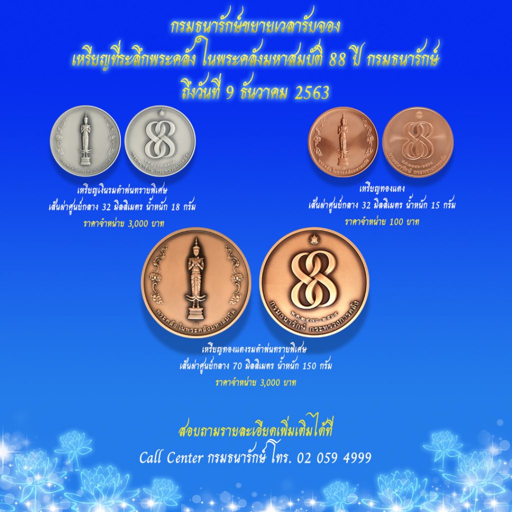นายยุทธนา หยิมการุณ อธิบดีกรมธนารักษ์ เปิดเผยว่า ตามที่กรมธนารักษ์ได้เปิดให้จองเหรียญที่ระลึกพระคลัง ในพระคลังมหาสมบัติ 88 ปี กรมธนารักษ์ ตั้งแต่วันที่ 2 – 30 พฤศจิกายน 2563 นั้น เนื่องจากว่ามีข้าราชการและประชาชนยังมีความต้องการในการจองเหรียญที่ระลึกดังกล่าว เพื่อเก็บไว้เป็นที่ระลึกและสักการะบูชาพระคลัง ในพระคลังมหาสมบัติ อีกเป็นจำนวนมาก กรมธนารักษ์จึงขยายเวลาการรับจองต่อไปอีกจนถึง วันที่ 9 ธันวาคม 2563 โดยมีรายละเอียด ดังนี้