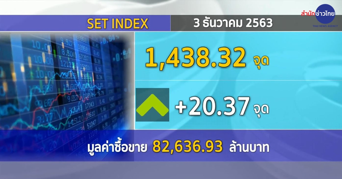 กรุงเทพฯ 3 ธ.ค. – ดัชนีตลาดหุ้นไทยวันนี้ (3 ธ.ค.) ปิดที่ 1,438.32 จุด เพิ่มขึ้น 20.37 จุด ด้วยมูลค่าการซื้อขาย 82,636.93 ล้านบาท. – สำนักข่าวไทย