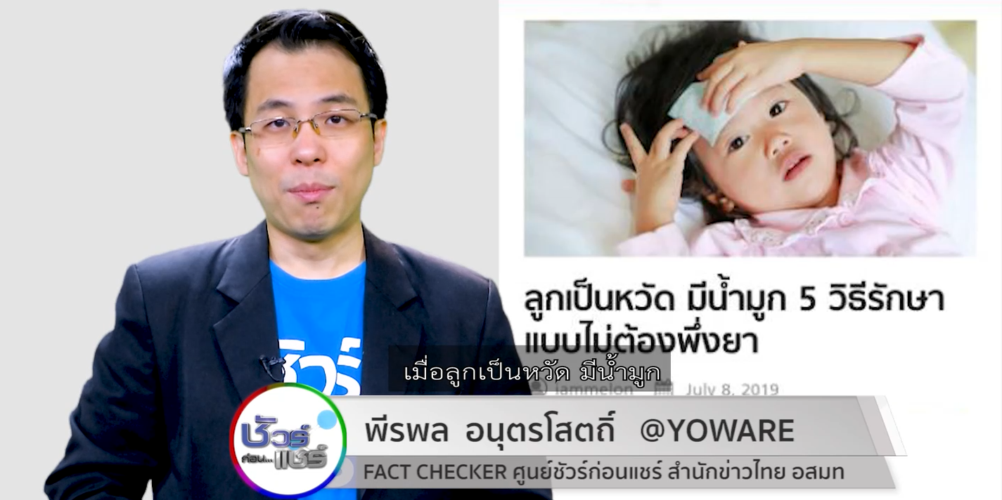 7 ธ.ค. – บนสังคมออนไลน์ 5 วิธีรักษาอาการหวัด มีน้ำมูกของเด็กโดยไม่พึ่งยา เรื่องนี้จริงหรือไม่ ติดตามกับ คุณพีรพล อนุตรโสตถิ์ จากศูนย์ชัวร์ก่อนแชร์