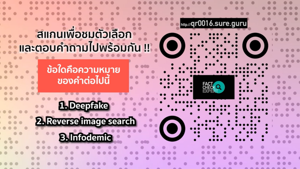 👉 เตรียมโทรศัพท์มือถือของคุณให้พร้อม แล้วร่วมเรียนรู้และตอบคำถามไปพร้อมๆ กัน ผ่านหน้าจอกับ FACT CHECK EXPERT ในบทเรียนที่ 16 “สรุปคำสำคัญส่งท้ายปี 2020” โดยคุณพีรพล อนุตรโสตถิ์ จากศูนย์ชัวร์ก่อนแชร์