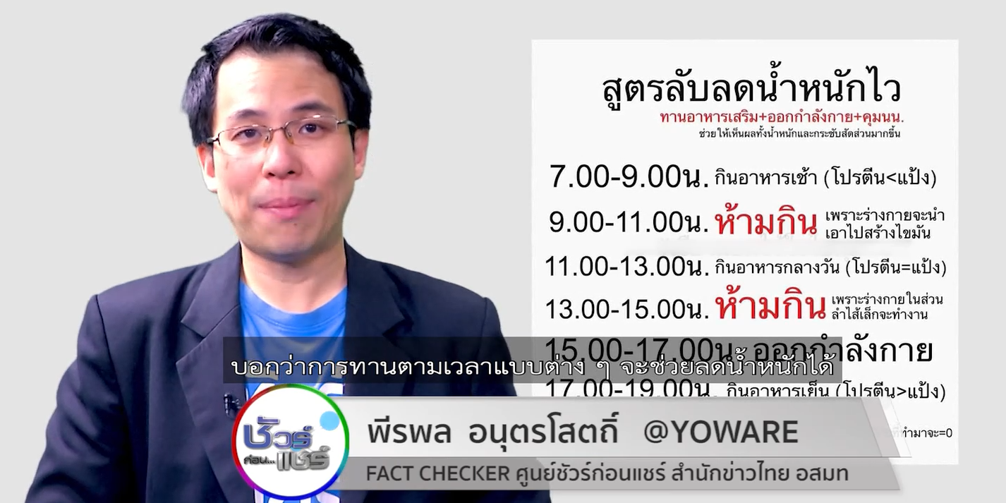 17 ธ.ค. – บนสังคมออนไลน์มีการแชร์ สูตรลับลดน้ำหนักไว บอกว่าการกินตามเวลาแบบต่าง ๆ จะลดน้ำหนักได้ เรื่องนี้จริงหรือไม่ ติดตามกับ คุณพีรพล อนุตรโสตถิ์ จากศูนย์ชัวร์ก่อนแชร์