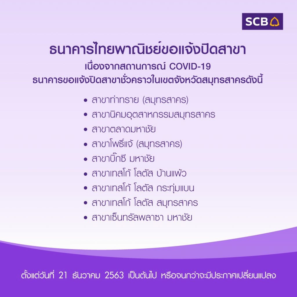 ธนาคารไทยพาณิชย์ขอแจ้งปิดสาขาชั่วคราว เนื่องจากสถานการณ์ COVID-19 ธนาคารขอแจ้งปิดสาขาชั่วคราว ดังต่อไปนี้