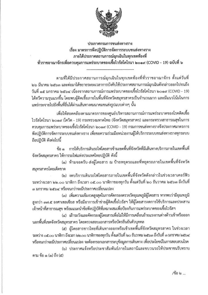 เพื่อให้สอดคล้องตามมาตรการของศูนย์บริหารสถานการณ์การแพร่ระบาดของโรคติดเชื้อไวรัสโคโรนา 2019 (โควิด – 19) กระทรวงมหาดไทย (จังหวัดสมุทรสาคร) และกระทรวงสาธารณสุขในการควบคุม การแพร่ระบาดของเชื้อไวรัสโคโรนา 2019 (COVID – 19) กรมการขนส่งทางรางจึงประกาศมาตรการพึงปฏิบัติการจัดการระบบขนส่งทางราง เพื่อขอความร่วมมือหน่วยงานผู้ให้บริการระบบขนส่งทางรางทุกระบบถือปฏิบัติ ดังต่อไปนี้