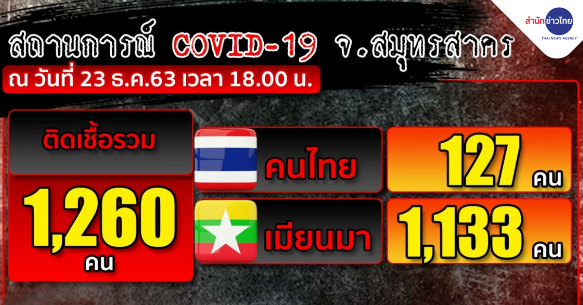 สำหรับตัวเลขผู้ติดเชื้อโควิด-19 ในพื้นที่ จ.สมุทรสาคร จนถึงวันนี้ (23 ธ.ค.) มียอดรวม 1,260 คน เป็นคนไทย 127 คน และเป็นแรงงานเมียนมา 1,133 คน. – สำนักข่าวไทย