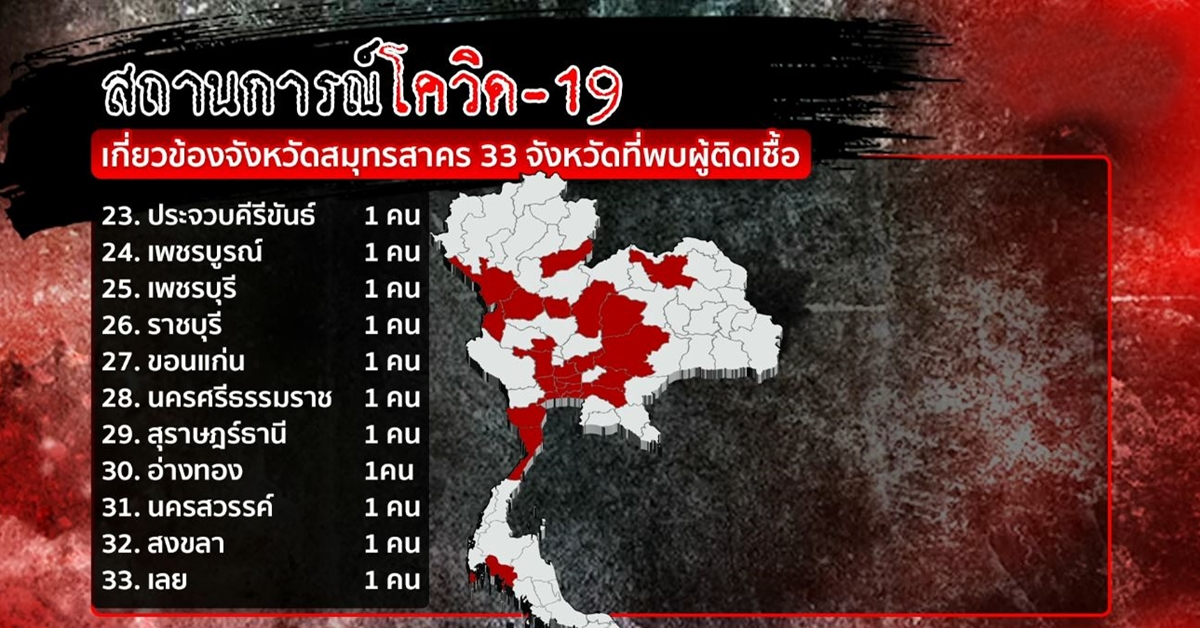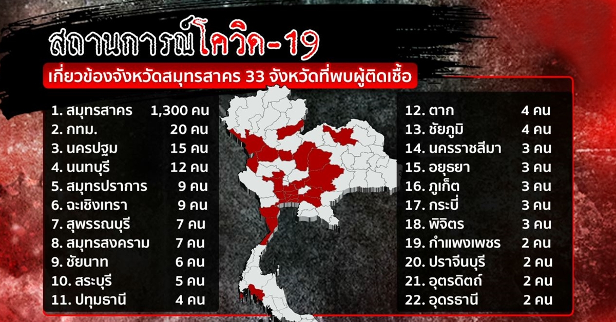 ภูมิภาค 24 ธ.ค. – ข้อมูลพบทั่วประเทศมีผู้ติดเชื้อโควิด-19 แล้ว 33 จังหวัด โดยจังหวัดที่พบผู้ติดเชื้อมากสุด คือ สมุทรสาคร ซึ่งเป็นต้นทางการแพร่ระบาดรอบใหม่
