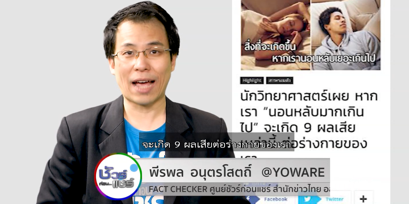 30 ธ.ค. – บนสังคมออนไลน์มีการแชร์ 9 ผลเสียที่เกิดจากการนอนหลับมากเกินไป ตั้งแต่เสี่ยงเกิดโรคหัวใจมากขึ้น ไปจนถึงสมองจะไม่ดีเหมือนเดิม เรื่องนี้จริงหรือไม่ ติดตามกับ คุณพีรพล อนุตรโสตถิ์ จากศูนย์ชัวร์ก่อนแชร์