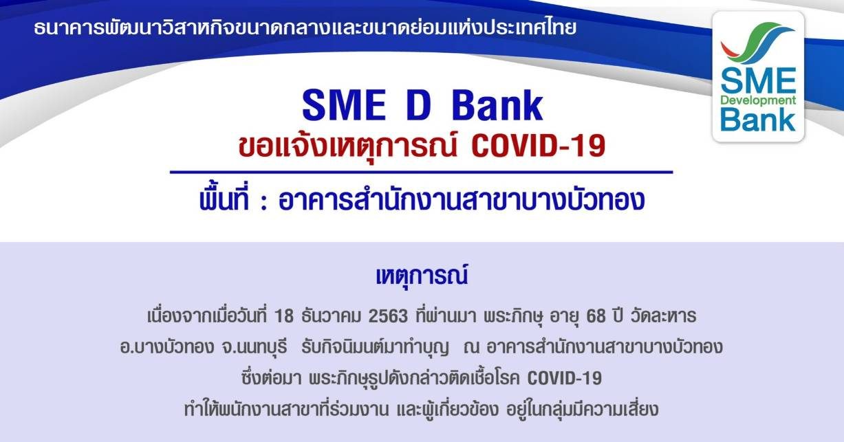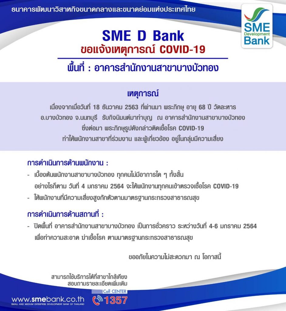 ธนาคารพัฒนาวิสาหกิจขนาดกลางและขนาดย่อมแห่งประเทศไทย(เอสเอ็มอีแบงก์)ขอแจ้งว่า เนื่องจากเมื่อวันที่ 18 ธันวาคม 2563 ที่ผ่านมา พระภิกษุ อายุ 68 ปี วัดละหาร อ.บางบัวทอง จ.นนทบุรี รับกิจนิมนต์มาทำบุญ ณ อาคารสำนักงานสาขาบางบัวทองของธนาคาร ซึ่งต่อมา พระภิกษุรูปดังกล่าว ติดเชื้อโรค COVID-19 ทำให้พนักงานสาขาที่ร่วมงาน และผู้เกี่ยวข้อง อยู่ในกลุ่มมีความเสี่ยง