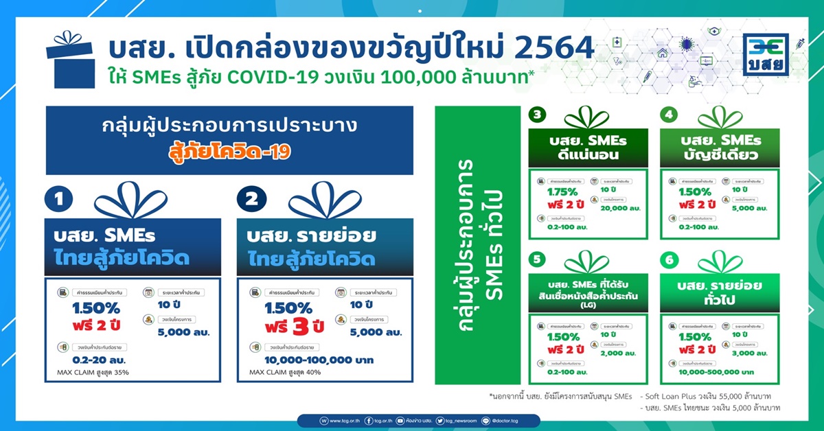 - โครงการ “บสย. รายย่อยไทย สู้ภัยโควิด” ฟรีค่าธรรมเนียมค้ำประกัน 3 ปี วงเงินค้ำประกันสินเชื่อต่อราย 1 หมื่นบาท – 1 แสนบาท ระยะเวลาค้ำประกัน 10 ปี วงเงินจัดสรร 5,000 ล้านบาท * MAX CLAIM สูงสุด 40%