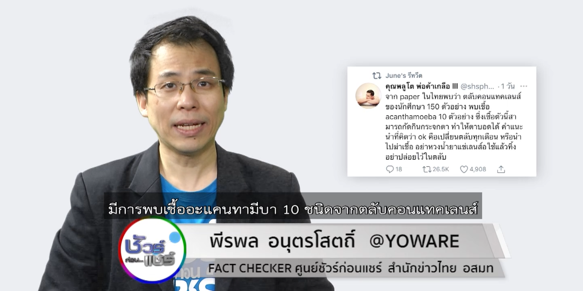 4 ม.ค. – บนสังคมออนไลน์ แชร์เตือนว่า คนที่ใส่คอนแทคเลนส์ควรเปลี่ยนตลับแช่คอนแทคเลนส์ทุกเดือนเพื่อป้องกันเชื้ออะแคนทามีบากัดกระจกตา แต่ข้อเท็จจริงเรื่องนี้เป็นอย่างไร ติดตามกับ คุณพีรพล อนุตรโสตถิ์ จากศูนย์ชัวร์ก่อนแชร์