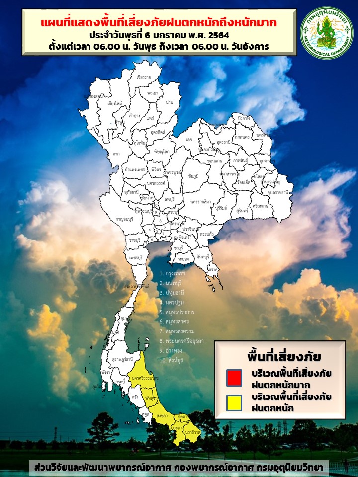 กรมอุตุฯ 6 ม.ค. – กรมอุตุฯ เตือนภาคใต้ยังมีฝนตกหนักบางพื้นที่ ระวังน้ำท่วมฉับพลัน-น้ำป่าไหลหลาก ขณะที่ภาคเหนือ-อีสาน ยังคงมีอากาศเย็นถึงหนาว