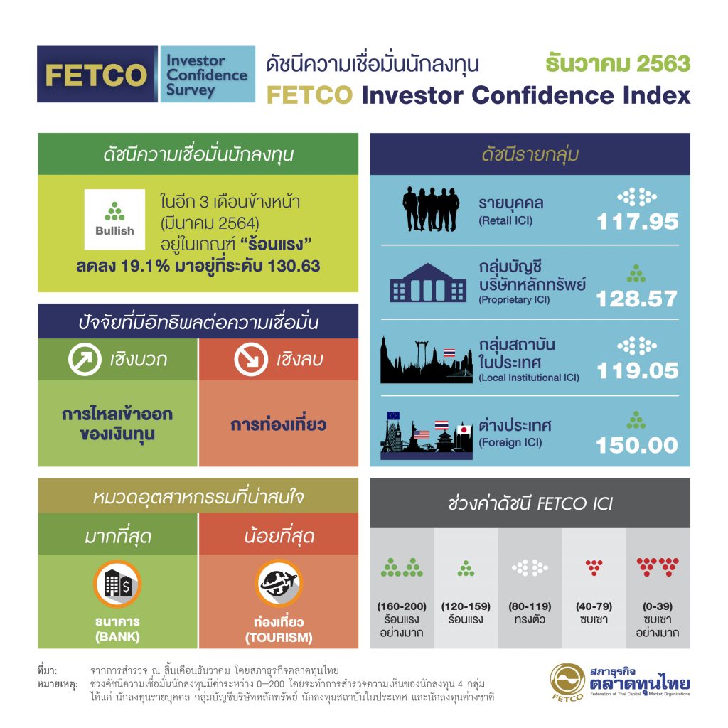 นายไพบูลย์ นลินทรางกูร ประธานกรรมการสภาธุรกิจตลาดทุนไทย เผยดัชนีความเชื่อมั่นนักลงทุน (FETCO Investor Confidence Index) ผลสำรวจในเดือนธันวาคม 2563 พบว่า ดัชนีฯ ในอีก 3 เดือนข้างหน้าอยู่ที่ระดับ 130.63 ปรับตัวลดลง 19.1% จากเดือนก่อนหน้าซึ่งอยู่ในเกณฑ์ “ร้อนแรงอย่างมาก” มาอยู่ในเกณฑ์ “ร้อนแรง” ซึ่งสะท้อนความเชื่อมั่นของนักลงทุนเมื่อเทียบกับความเคลื่อนไหวของดัชนีตลอดทั้งปี นักลงทุนคาดหวังการไหลเข้าของเงินทุนเป็นปัจจัยหนุนมากที่สุด รองลงมาคือการเติบโตของเศรษฐกิจในประเทศ และผลประกอบการบริษัทจดทะเบียน สำหรับปัจจัยที่ฉุดความเชื่อมั่นนักลงทุนมากที่สุด ได้แก่ การท่องเที่ยว รองลงมาคือสถานการณ์ความขัดแย้งระหว่างประเทศ และการถดถอยของเศรษฐกิจในประเทศ รวมถึงการระบาดของ Covid-19 ระลอกใหม่