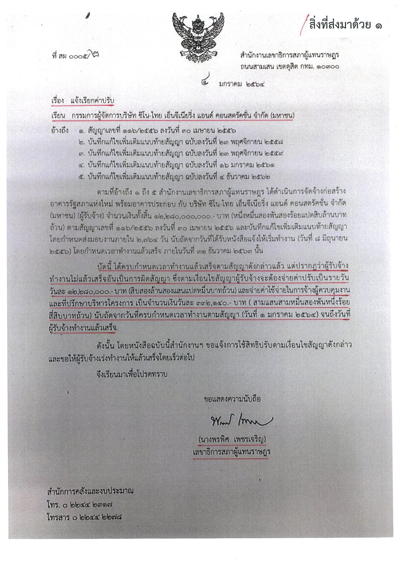 นายวัชระ กล่าวว่า ตนในฐานะประชาชนผู้เสียภาษีอากรเต็มจำนวน และมีส่วนได้เสียตามรัฐธรรมนูญ พ.ศ.2560 ขอคัดค้านแนวคิดและคำสั่งการของนางพรพิศ ที่ได้มีหนังสือลงวันที่ 4 มกราคม 2564 ถึงบริษัทผู้รับเหมา เพื่อเรียกค่าปรับเนื่องจากผิดสัญญา โดยระบุว่า บัดนี้ได้ครบกำหนดเวลาทำงานแล้วเสร็จตามสัญญาดังกล่าวแล้ว แต่ปรากฏว่า ผู้รับจ้างทำงานไม่แล้วเสร็จ อันเป็นการผิดสัญญา ซึ่งตามเงื่อนไขสัญญา ผู้รับจ้างจะต้องจ่ายค่าปรับเป็นรายวัน วันละ 12,280,000 บาท (สิบสองล้านสองแสนแปดหมื่นบาทถ้วน) และค่าใช้จ่ายในการจ้างผู้ควบคุมงานและที่ปรึกษาบริหารโครงการ เป็นจำนวนเงินวันละ 332,140 บาท (สามแสนสามหมื่นสองพันหนึ่งร้อยสี่สิบบาทถ้วน) นับถัดจากวันที่ครบกำหนดเวลาทำงานตามสัญญา (วันที่ 1 มกราคม 2564) จนถึงวันที่ผู้รับจ้างทำงานแล้วเสร็จ การงดหรือปรับลดค่าปรับตามกฎหมายเป็นอำนาจและหน้าที่ของหัวหน้าส่วนราชการ ดังนั้น หากคณะกรรมการมีมติเกินกว่าอำนาจหน้าที่ที่กฎหมายบัญญัติไว้ และหากเข้าข่ายเอื้ออำนวยประโยชน์แก่บริษัทเอกชน ไม่รักษาผลประโยชน์ของทางราชการ หากคณะกรรมการมีมติอย่างหนึ่งอย่างใดทำให้รัฐเสียหายแม้แต่น้อย ตนจะยื่นหนังสือร้องทุกข์กล่าวโทษผู้ลงมติทุกคนต่อคณะกรรมการป้องกันและปราบปรามการทุจริตแห่งชาติ (ป.ป.ช.) ทันที เพื่อรักษาผลประโยชน์ของแผ่นดินตามที่บัญญัติไว้ในรัฐธรรมนูญ. – สำนักข่าวไทย