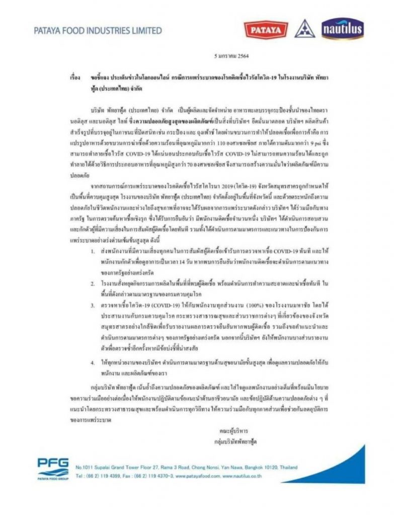 ผู้สื่อข่าวรายงานว่า กลุ่มบริษัท พัทยา ฟู้ด (ประเทศไทย) จำกัด ซึ่งเป็นผู้ผลิตและจัดจำหน่ายอาหารทะเลและอาหารกระป๋องตรานอติลุส และ นอติลุส ไลท์ ได้เปิดเผยผังการจัดทำสถานที่สังเกตอาการแรงงานในโรงงานที่ตรวจพบเชื้อโควิด-19 หรือ Factory Quantine (FQ) หลังตรวจหาเชื้อโควิด-19 เชิงรุก 100% ในโรงงานซึ่งตั้งอยู่ในตำบลมหาชัย อ. เมือง จ. สมุทรสงคราม แล้วพบผู้ติดเชื้อ 914 คน ซึ่งต่อมาคณะผู้บริหารกลุ่มบริษัทพัทยา ฟู้ด ออกหนังสือความว่า ได้ดำเนินการตามมาตรการและแนวทางในการป้องกันการแพร่ระบาดอย่างเร่งด่วนเข้มข้นสูงสุด โดยส่งพนักงานที่มีความเสี่ยงทุกคนในการสัมผัสผู้ติดเชื้อเข้ารับการตรวจหาเชื้อ COVD-19 ทันที และ ให้พนักงานกักตัวเพื่อดูอาการเป็นวลา 14 วัน หากพบการยืนยันว่า พนักงานติดเชื้อจะดำเนินการตามแนวทางของภาครัฐอย่างเคร่งครัด โรงงานสั่งหยุดกิจกรรมการผลิตในพื้นที่ที่พบผู้ติดเชื้อ พร้อมดำเนินการทำความสะอาดและฆ่าเชื้อทันที ในพื้นที่ดังกล่าวตามมาตรฐานของกรมควบคุมโรค ให้ทุกหน่วยของบริษัทฯ ดำเนินการตามมาตรฐานสุขอนามัยขั้นสูงสุด เพื่อดูแลความปลอดภัยให้กับพนักงานและผลิตภัณฑ์ของเรา