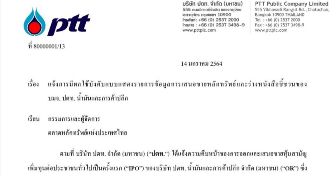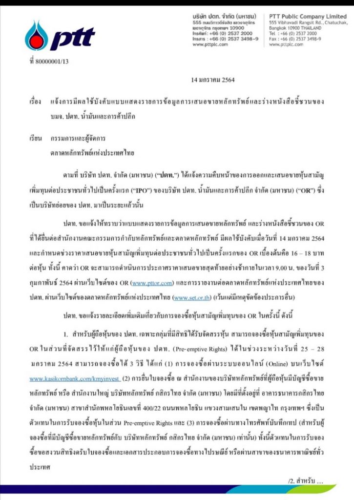 ทั้งนี้ แบบแสดงรายการข้อมูลการเสนอขายหลักทรัพย์ และร่างหนังสือชี้ชวนของ OR ที่ได้ยื่นต่อสำนักงานคณะกรรมการกำกับหลักทรัพย์และตลาดหลักทรัพย์ (ก.ล.ต.) มีผลใช้บังคับเมื่อวันที่ 14 ม.ค.64 . – สำนักข่าวไทย