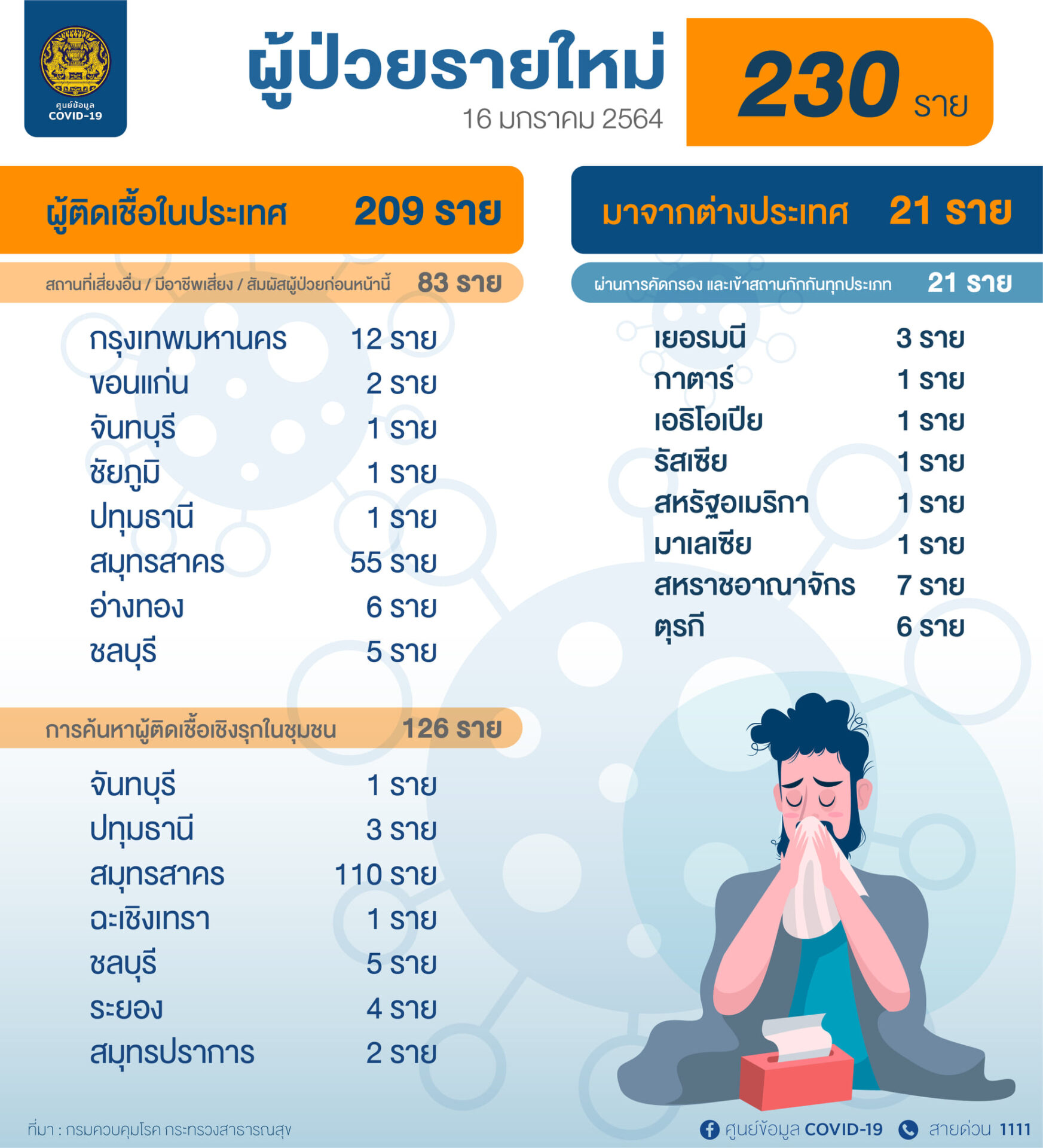นพ.ทวีศิลป์ วิษณุโยธิน โฆษกศูนย์บริหารสถานการณ์การแพร่ระบาดของโรคติดเชื้อไวรัสโคโรนา 2019 (โควิด-19) หรือ ศบค. แถลงสถานการณ์การแพร่ระบาดของโควิด-19 วันนี้ (16 ม.ค.) ว่า มีผู้ติดเชื้อใหม่ 230 ราย ติดเชื้อในประเทศ 209 ราย ติดเชื้อจากต่างประเทศ 21 ราย ทำให้มีผู้ติดเชื้อสะสม 11,680 ราย หายแล้ว 8,906 ราย ยอดเสียชีวิตใหม่ 1 ราย รวมเสียชีวิตสะสม 70 ราย จังหวัดที่พบผู้ป่วยคงที่รวม 60 จังหวัด