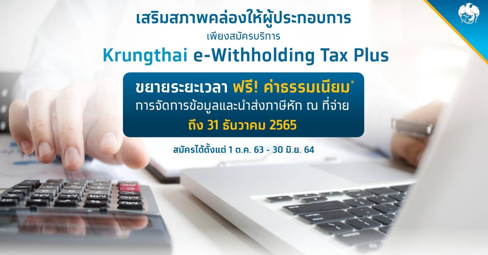นอกจากนี้ ยังมีสิทธิพิเศษสำหรับผู้ประกอบการที่สมัครใช้บริการ Krungthai e-Withholding Tax Plus ระหว่างวันที่ 1 ตุลาคม 2563 – 30 มิถุนายน 2564 ฟรีค่าธรรมเนียมการจัดการข้อมูลและนำส่งภาษีหัก ณ ที่จ่าย ตั้งแต่วันที่สมัคร จนถึง 31 ธันวาคม 2565 สำหรับผู้ประกอบการที่สนใจสามารถสมัครใช้บริการ ได้ที่ตัวแทนธนาคารผู้ดูแลลูกค้า หรือติดต่อผ่านทางช่องทางธุรกิจ Krungthai Corporate Call Center 02-111-9999 อีเมล cash.management@krungthai.com . – สำนักข่าวไทย