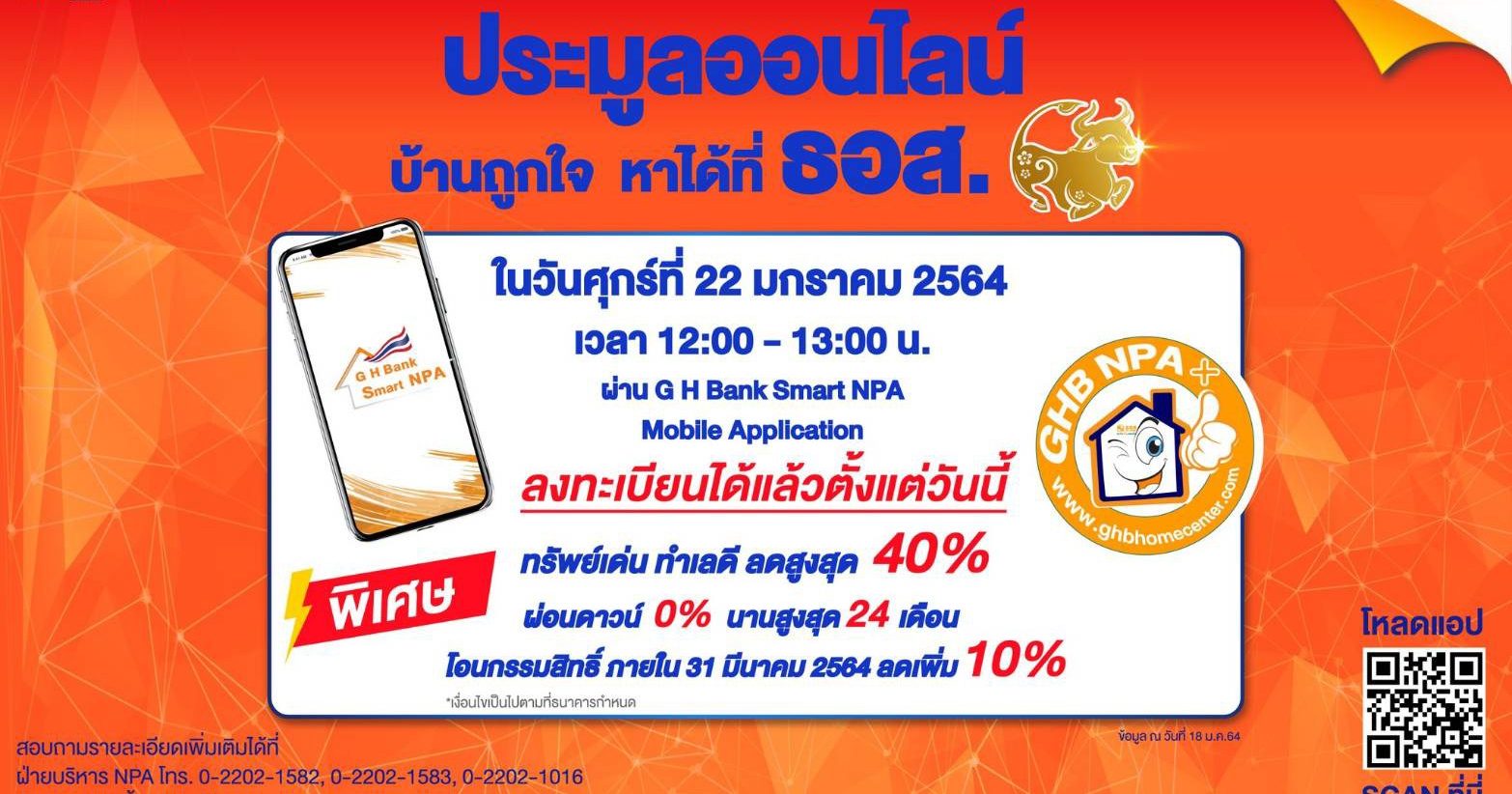 นายฉัตรชัย ศิริไล กรรมการผู้จัดการ ธนาคารอาคารสงเคราะห์ (ธอส.) เปิดเผยว่า ตามที่ในปี 2563 ธอส. จัดให้มีการประมูลขายทรัพย์ NPA หรือบ้านมือสองออนไลน์ผ่าน Application : G H Bank Smart NPA เพื่ออำนวยความสะดวกให้กับประชาชนที่ต้องการมีที่อยู่อาศัยในราคาที่คุ้มค่าโดยไม่ต้องเดินทางไปประมูลซื้อที่ธนาคาร ลดความเสี่ยงของการติดเชื้อไวรัสโคโรนา 2019 (COVID-19) จากการเดินทางไปในพื้นที่สาธารณะ ซึ่งการจัดประมูลออนไลน์ทั้ง 7 ครั้งตั้งแต่เดือนกรกฎาคม 2563 เป็นต้นมา มีลูกค้าประชาชนให้ความสนใจเข้าร่วมประมูลทรัพย์ออนไลน์ของธนาคารเป็นจำนวนมาก โดยสามารถจำหน่ายทรัพย์ได้ทั้งสิ้น 701 รายการ คิดเป็น มูลค่าที่ปิดประมูลจำนวนถึง 735.18 ล้านบาท และจากความสำเร็จในปีที่ผ่านมาทำให้ในปี 2564 ธนาคารยังคงเดินหน้าจัดให้มีการประมูลบ้านมือสองออนไลน์เช่นเดิมเป็นประจำทุกเดือน ซึ่งการประมูลครั้งแรกของปี 2564 กำหนดจัดขึ้นในวันศุกร์ที่ 22 มกราคม 2564 เวลา 12.00 -13.00 น. โดยนำทรัพย์คัดทรัพย์ใหม่สภาพดีทั่วประเทศรวม 990 รายการ ทั้งประเภททาวน์เฮ้าส์ บ้านเดี่ยว บ้านแฝด ห้องชุด อาคารพาณิชย์ และที่ดินเปล่า มาเปิดประมูลให้กับลูกค้าที่ต้องการมีบ้านได้เลือกซื้อง่าย ๆ พร้อมกันทั่วประเทศผ่าน Application : G H Bank Smart NPA แบ่งเป็น