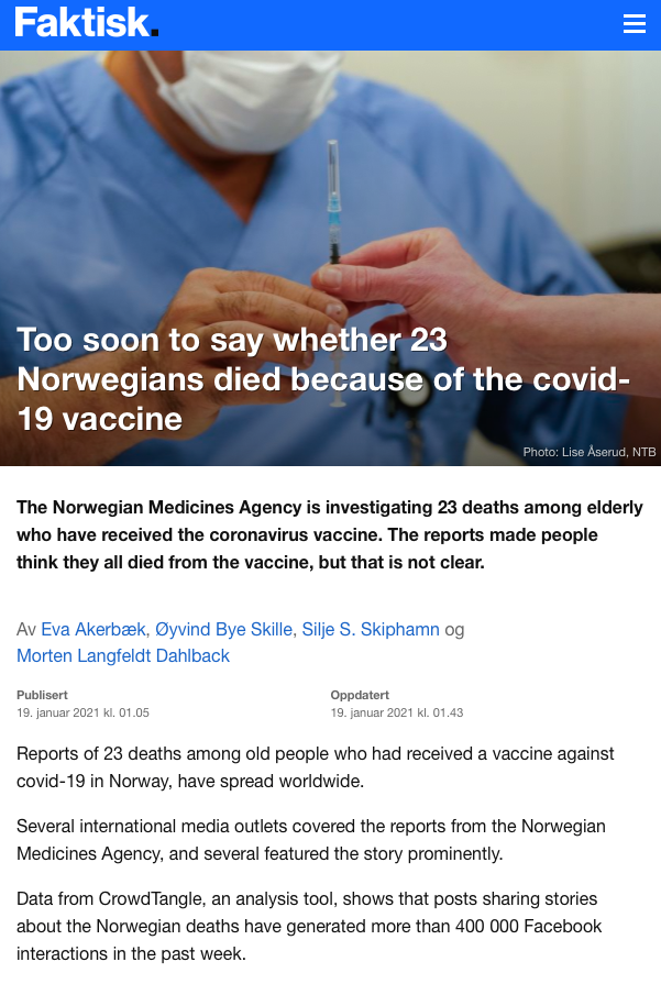 [ อ่านบทความเพิ่มเติม ] https://www.faktisk.no/artikler/1wY/too-soon-to-say-whether-23-norwegians-died-because-of-the-covid-19-vaccine