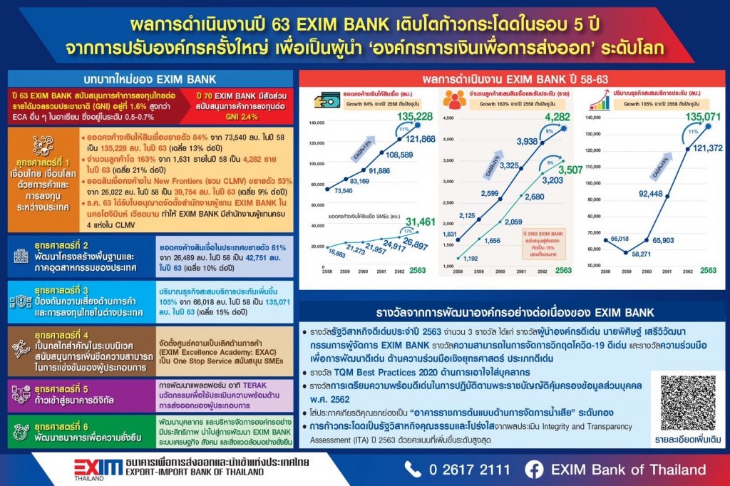 โดย EXIM BANK สามารถบริหารจัดการการเงินและธุรกิจ ควบคู่กับการบริหารความเสี่ยงด้านสังคมและสิ่งแวดล้อม และการยึดมั่นในหลักการกำกับดูแลกิจการที่ดีเพื่อความยั่งยืน จนทำให้องค์กรยังมีฐานะการเงินในระดับที่แข็งแกร่ง มีอัตราส่วนสินเชื่อด้อยคุณภาพ (NPL Ratio) ณ สิ้นปี 2563 อยู่ที่ 3.81% จากจำนวนสินเชื่อด้อยคุณภาพ 5,153 ล้านบาท