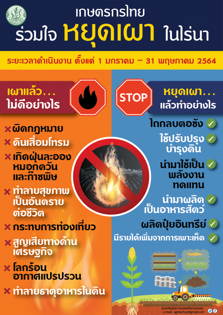 นายเฉลิมชัย ศรีอ่อน รัฐมนตรีว่าการกระทรวงเกษตรและสหกรณ์กล่าวว่า ได้สั่งการให้ทุกหน่วยงานสังกัดกระทรวงเกษตรฯ ดูแลปัญหาเรื่องการเผาพื้นที่เกษตรมาอย่างต่อเนื่องเพื่อลดผลกระทบจากฝุ่นละอองขนาดเล็ก PM2.5 โดยกรมส่งเสริมการเกษตรสร้างและพัฒนาเครือข่ายเกษตรปลอดการเผา รวมถึงเร่งรัดจัดการเพื่อแก้ไขปัญหาการเผาในพื้นที่เกษตร และการสาธิตการจัดการเศษวัสดุเหลือใช้จากภาคการเกษตร มีวัตถุประสงค์ให้เกษตรกรเข้าใจปัญหาที่เกิดจากการเผา รวมถึงทราบแนวทางการใช้เทคโนโลยีการเกษตรทดแทนการเผา จัดให้มีการสาธิตและถ่ายทอดเทคโนโลยีเพื่อทดแทนการเผา ตั้งศูนย์สาธิตเทคโนโลยีการเกษตรปลอดการเผาเพื่อสาธิตการใช้เทคโนโลยีการไถกลบตอซังฟางข้าวทดแทนการเผาโดยให้ชุมชนเกษตรเป็นผู้บริหารจัดการ การให้บริการเครื่องจักรกลเกษตรทดแทนการเผาแก่เกษตรกรในพื้นที่ดำเนินงานและใกล้เคียง รวมทั้งจัดตั้งเครือข่ายเกษตรกรปลอดการเผาเพื่อใช้เป็นกลไกในการปฏิบัติการลดการเผาเศษซากพืช