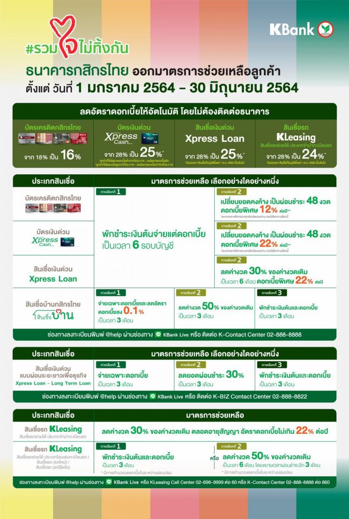 ▪สินเชื่อเงินด่วนแบบผ่อนระยะยาวเพื่อธุรกิจ Xpress Loan – Long Term Loan มอบมาตรการช่วยเหลือเพิ่ม 3 ทางเลือก คือ ทางเลือกที่ 1 จ่ายเฉพาะดอกเบี้ยเป็นเวลา 3 เดือน ทางเลือกที่ 2 ลดยอดผ่อนชำระ 30% เป็นเวลา 3 เดือน และทางเลือกที่ 3 พักชำระเงินต้นและดอกเบี้ยเป็นเวลา 3 เดือน เพื่อรักษาระยะห่างและลดความเสี่ยงในช่วงโควิด ช่องทางการลงทะเบียนพิมพ์ @help ผ่านช่องทางไลน์ KBank Live หรือ ติดต่อ K-BIZ Contact Center 02-888-8822