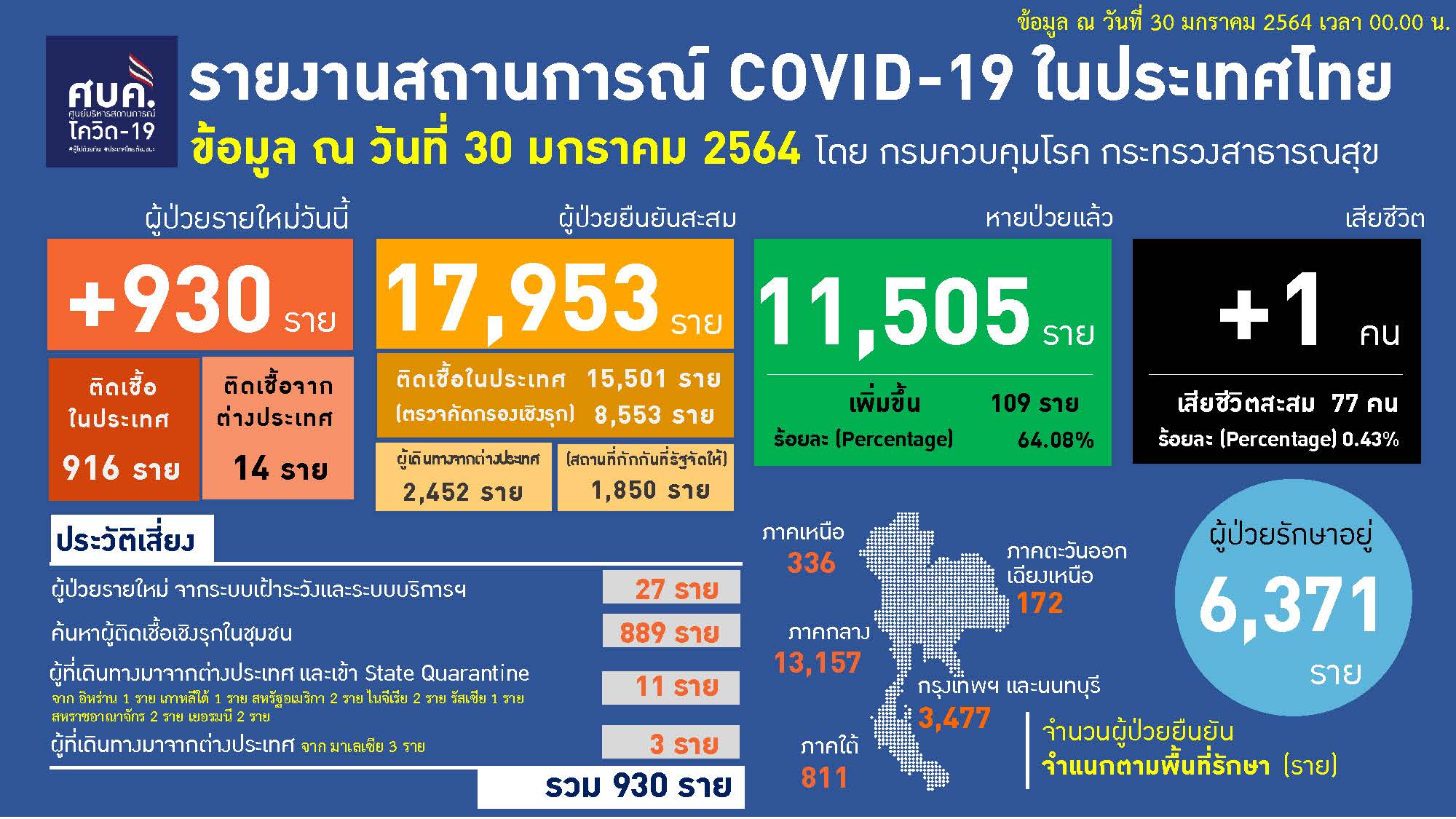 วันนี้ (30 ม.ค.) พญ.พรรณประภา ยงค์ตระกูล ผู้ช่วยโฆษกศูนย์บริหารสถานการณ์การแพร่ระบาดของโรคติดเชื้อไวรัสโคโรนา 2019 (ศบค.) แถลงสถานการณ์การแพร่ระบาดของโรคโควิด-19 โดยในวันนี้มีผู้ติดเชื้อทั้งหมด 930 ราย แบ่งเป็น ติดเชื้อในประเทศ 916 ราย จากต่างประเทศ 14 ราย ทำให้มีผู้ติดเชื้อสะสม 17,953 ราย และวันนี้มีผู้เสียชีวิตเพิ่มอีก 1 ราย ทำให้มียอดผู้เสียชีวิตสะสม 77 ราย
