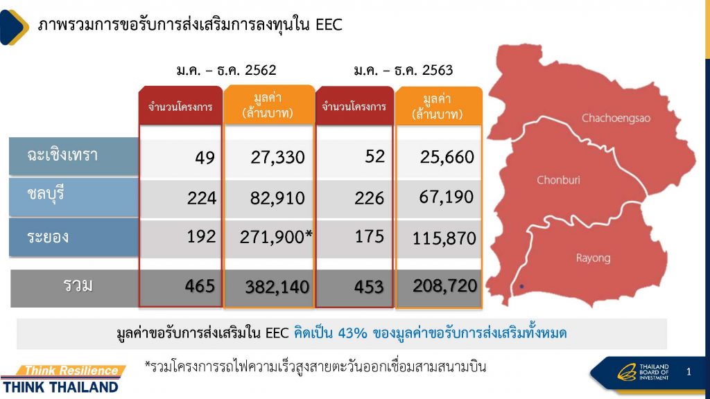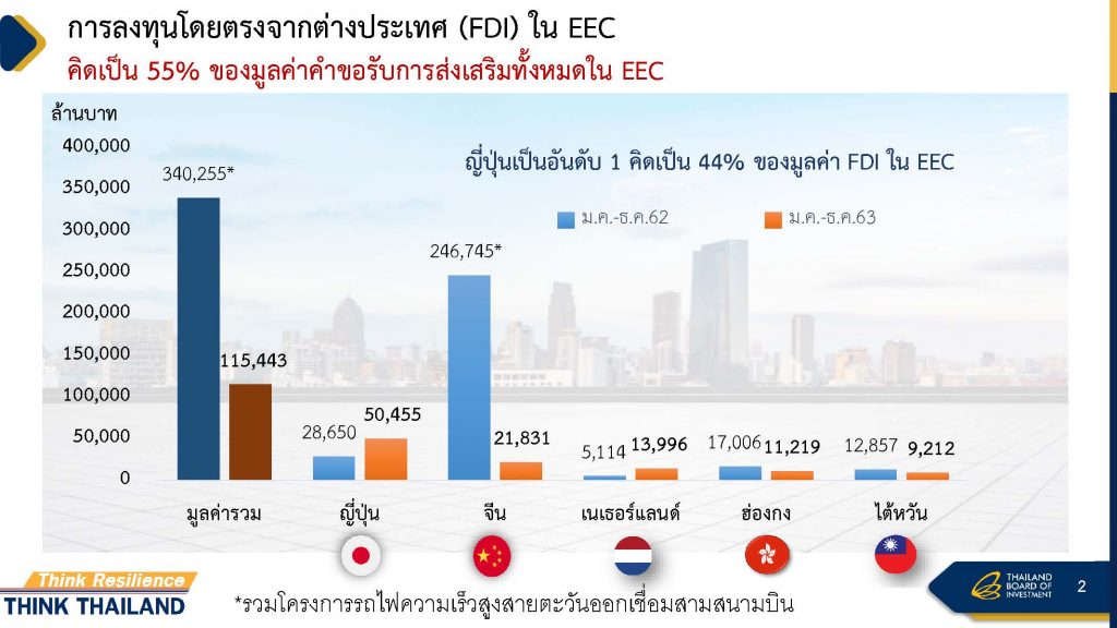 สำหรับการลงทุนปี 2563 เป็นการลงทุนจากต่างประเทศรวม 1.15 แสนล้านบาท คิดเป็น 55% ของมูลค่าขอรับส่งเสริมทั้งหมดใน อีอีซี โดยนักลงทุนจากประเทศญี่ปุ่น เข้ามาลงทุนใน อีอีซี สูงสุด มูลค่าการลงทุน 50,455 ล้านบาท คิดเป็น 44% และอันดับสองเป็นนักลงทุนจากจีน มูลค่าการลงทุน 21,831 ล้านบาท ด้านความคืบหน้า โครงการที่ยื่นขอรับส่งเสริมการลงทุนใน อีอีซี ในปี 2563 จาก 453 โครงการ ได้อนุมัติคำขอแล้ว 292 โครงการ คิดเป็น 64% ออกบัตรส่งเสริมแล้ว 172 โครงการ คิดเป็น 59% และได้เริ่มโครงการแล้ว 79 โครงการ คิดเป็น 46%