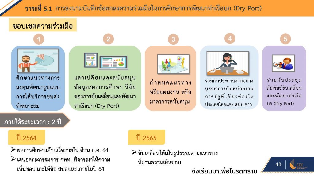 ขณะเดียวกันร่วมมือพัฒนาท่าเรือบก (Dry Port) แหลมฉบัง ก้าวสู่ศูนย์กลางขนส่งสินค้านานาชาติ เพื่อเชื่อมต่อระบบขนส่งและโลจิสติกส์ของไทย ให้เป็นโครงข่ายการขนส่งสินค้า เปิดประตูการค้าให้ สปป. ลาว ที่ไม่มีทางออกสู่ทะเล และสนับสนุนโครงการท่าเรือแหลมฉบัง ระยะที่ 3 โดยพัฒนาท่าเรือบกให้เป็นโครงข่ายเชื่อมโยงขนส่งสินค้า จากประเทศจีน สปป.ลาว และประเทศไทย ขับเคลื่อนท่าเรือแหลมฉบังก้าวสู่ศูนย์กลางการค้า การบริการ และการลงทุนโดยเฉพาะด้านระบบโลจิสติกส์ที่จะเชื่อมโยงกับนานาชาติ โดยความร่วมมือศึกษาการพัฒนาท่าเรือบก จะแล้วเสร็จในเดือนกรกฎาคม 2564 นี้