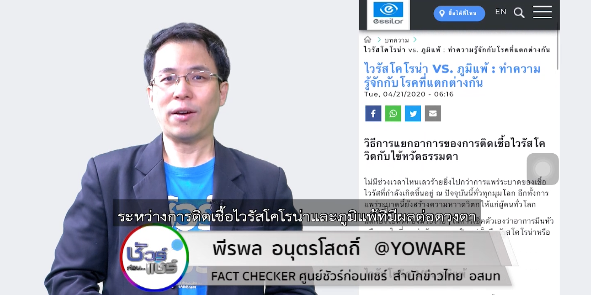 1 ก.พ. – บนสังคมออนไลน์ แชร์ภาพพร้อมข้อความถึงความแตกต่างระหว่างไวรัสโคโรน่ากับภูมิแพ้ที่แสดงอาการทางดวงตา แต่ข้อเท็จจริงเรื่องนี้เป็นอย่างไร ติดตามกับ คุณพีรพล อนุตรโสตถิ์ จากศูนย์ชัวร์ก่อนแชร์