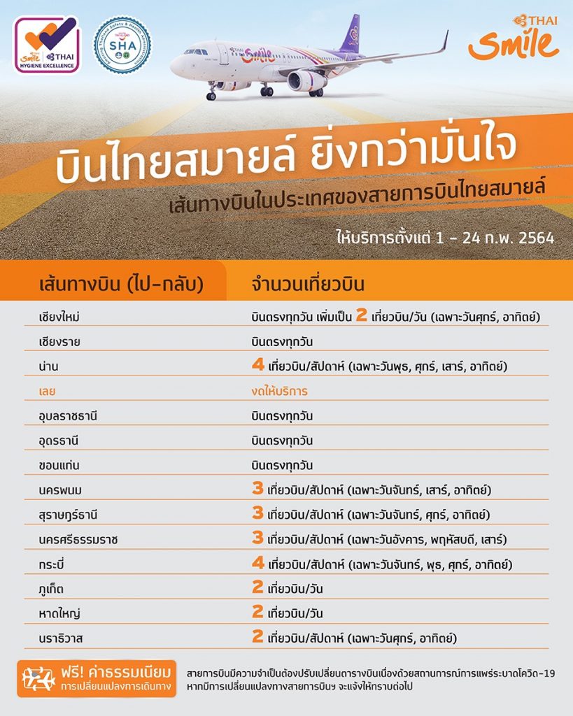 ผู้สื่อข่าวรายงานว่า สายการบินไทยสมายล์ ได้ออกประกาศเพิ่มจำนวนเที่ยวบินและเส้นทางบินในประเทศเพื่อให้สอดคล้องกับปริมาณความต้องการการเดินทางของผู้โดยสาร ระหว่างวันที่ 1-24 กุมภาพันธ์ 2564 โดยเส้นทางบิน ประกอบด้วย