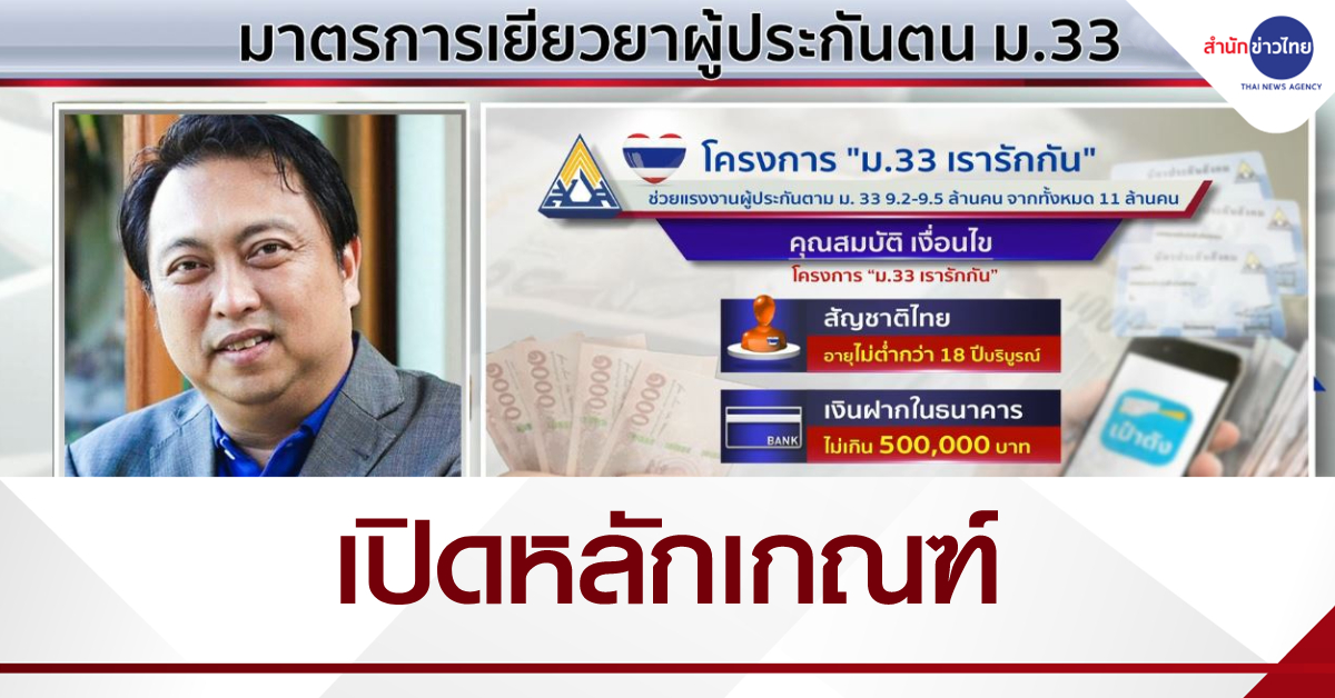 กรุงเทพฯ 3 ก.พ. – นายสุชาติ ชมกลิ่น รัฐมนตรีว่าการกระทรวงแรงงาน เปิดเผยหลักเกณฑ์ในการช่วยเหลือเยียวยาผู้ประกันตนในระบบประกันสังคม มาตรา 33 ที่ได้รับผลกระทบจากโควิด-19 หลังนายกรัฐมนตรี เคาะชื่อมาตรการดังกล่าวว่า “ม.33 เรารักกัน” ช่วยเหลือ 11 ล้านคน ตัดเกณฑ์เหลือเงินฝากไม่เกิน 500,000 บาท เข้า ครม.เร็วสุดวันอังคารหน้า (9 ก.พ.). – สำนักข่าวไทย