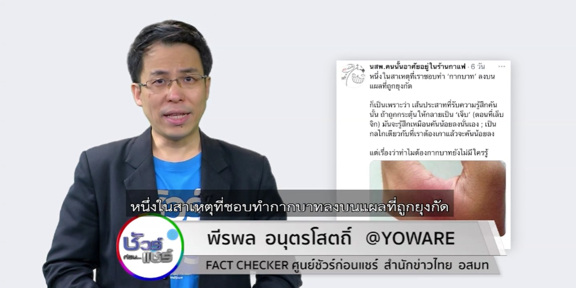 5 ก.พ. – บนสังคมออนไลน์ แชร์ภาพพร้อมข้อความแนะนำว่า การทำกากบาทบนผิวหนังที่ถูกยุงกัดจะช่วยลดอาการคันได้ แต่ข้อเท็จจริงเรื่องนี้เป็นอย่างไร ติดตามกับ คุณพีรพล อนุตรโสตถิ์ จากศูนย์ชัวร์ก่อนแชร์