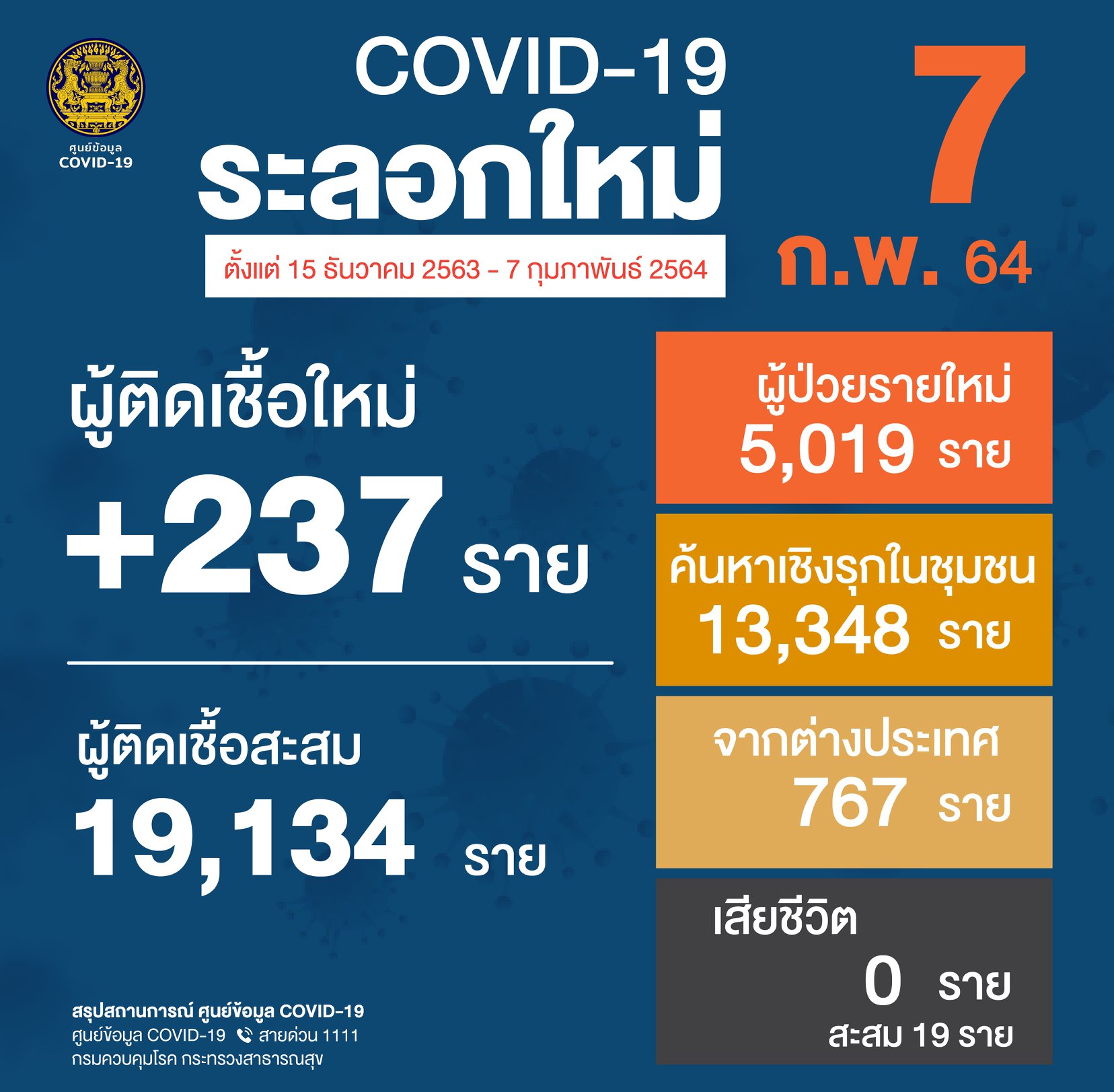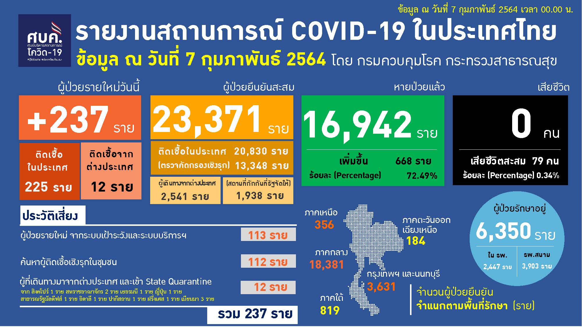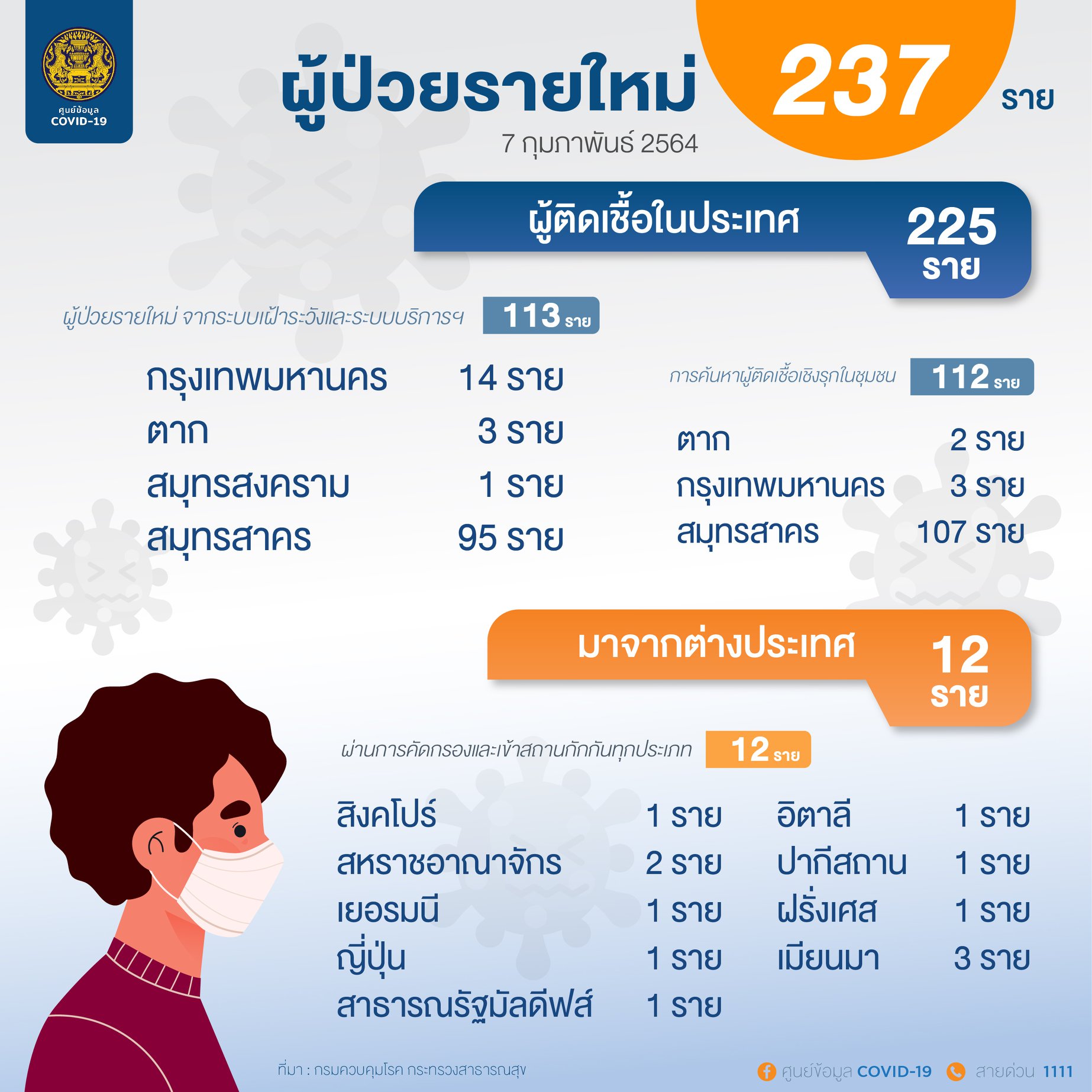 พญ.พรรณประภา ยงค์ตระกูล ผู้ช่วยโฆษกศูนย์บริหารสถานการณ์การแพร่ระบาดของโรคติดเชื้อไวรัสโคโรนา 2019 (โควิด-19) หรือ ศบค. รายงานสถานการณ์ผู้ติดเชื้อโควิด-19 ในประเทศไทยว่า จังหวัดที่พบการติดเชื้อโควิด-19 ในวันนี้ (7 ก.พ.) จำกัดพื้นที่เหลือเพียง 4 จังหวัดแล้ว ได้แก่ สมุทรสาคร สมุทรสงคราม กรุงเทพฯ และ ตาก ขณะเดียวกัน วันนี้พบผู้ติดเชื้อรายใหม่เพิ่ม 237 ราย แบ่งเป็นผู้ติดเชื้อในประเทศ 225 ราย แบ่งเป็นระบบเฝ้าระวังและบริการ 113 ราย และผู้ติดเชื้อจากการคัดกรองเชิงรุกในชุมชน 112 ราย กลุ่มผู้เดินทางมาจากต่างประเทศและเข้าสถานกักกันโรค (Quarantine) 12 ราย รวมป่วยยืนยันสะสม 23,371 ราย ไม่พบเสียชีวิตเพิ่มในวันนี้