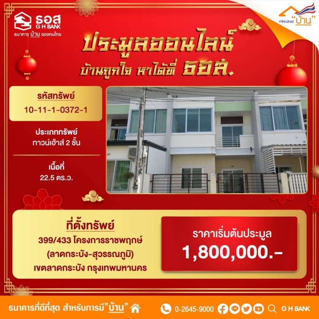 กรุงเทพฯ 9 ก.พ. – ธนาคารอาคารสงเคราะห์ ร่วมฉลองเทศกาลตรุษจีน คัดบ้านมือสอง สภาพดี คุ้มราคา ทั่วประเทศรวม 999 รายการ มาเปิดประมูลออนไลน์ประจำเดือนกุมภาพันธ์ 2564 ผ่าน Application : G H Bank Smart NPA ลดสูงสุดถึง 40% จากราคาปกติ ราคาเริ่มต้นประมูลต่ำสุดเพียง45,000 บาทเท่านั้น พิเศษ!! มอบ อั่งเปาส่วนลดเพิ่มอีก 10% จากราคาที่ปิดประมูลหากทำสัญญาและทำนิติกรรมภายใน 30 เมษายน 2564 พร้อมโปรโมชั่นผ่อนดาวน์หรือสินเชื่ออัตราดอกเบี้ย 0% เริ่มประมูลพร้อมกันวันตรุษจีน 11 กุมภาพันธ์ 2564 ระหว่างเวลา 12.00 -13.00 น.